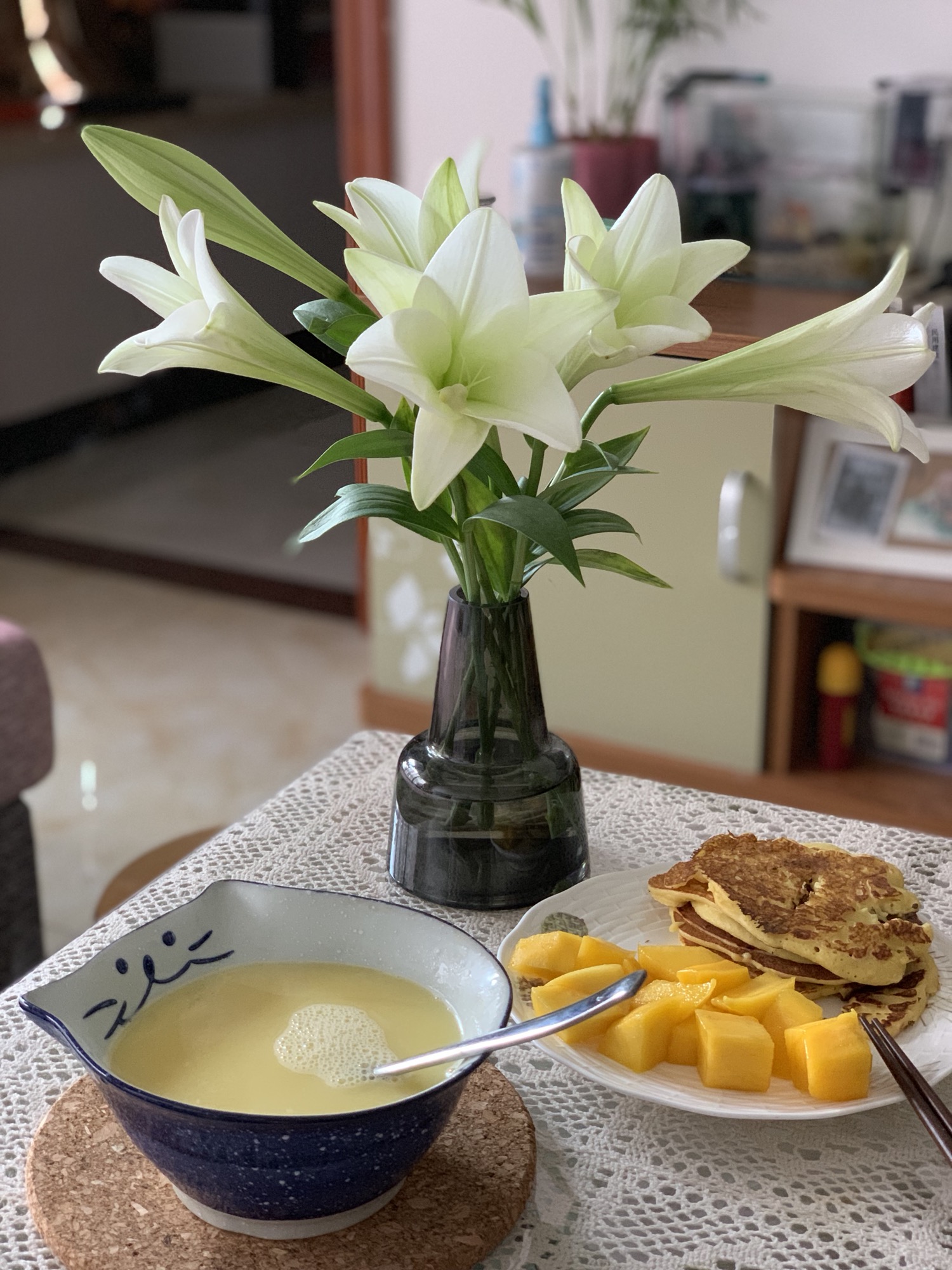 早餐吃煎饼和玉米汁,饼煎糊了🙂