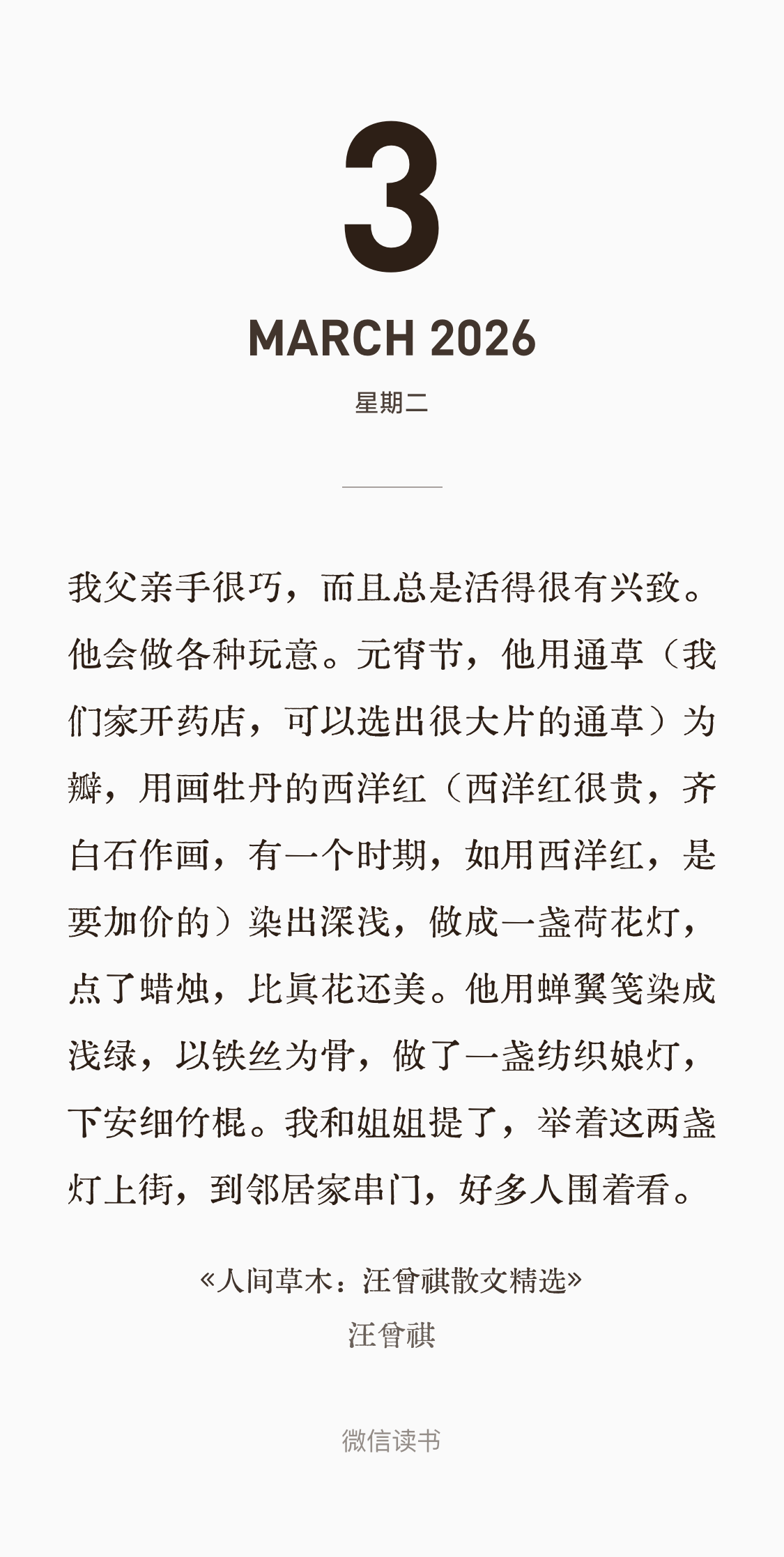 前段时间看到汪曾祺这段,想到我小学一二年级一个元宵节,学校让第二天带花灯去。我的外婆和妈妈用粉绿彩纸剪出莲花瓣和叶子,拿米浆糊在一只吃空了的榨菜玻璃罐上;里面放一枚小蜡烛,罐口系紧绳子,绳子另一头绑上筷子作提杆,造出一盏素朴可爱的莲花灯来。