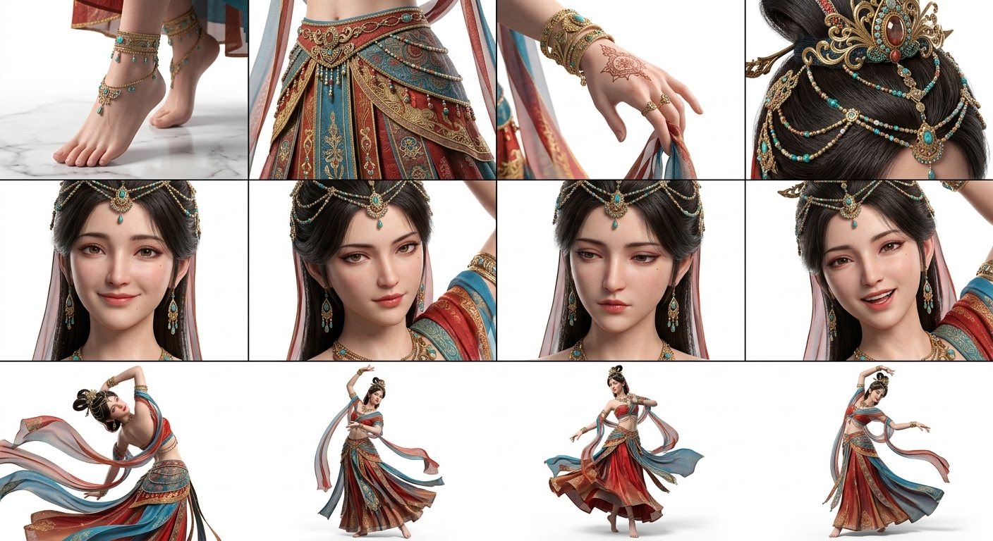 镜头拍摄:人物四个细节特写、四种日常的不同脸部表情特写、四种日常的不同的姿势。3D动漫CG风游戏CGOC渲染质感。人物描述:皮肤质感,皮肤细腻,自然眼疵,人物动作妩媚,在跳舞(注意:
