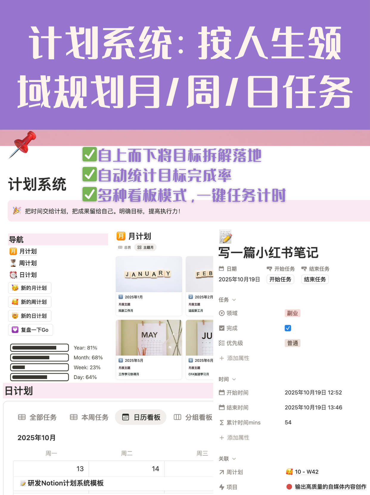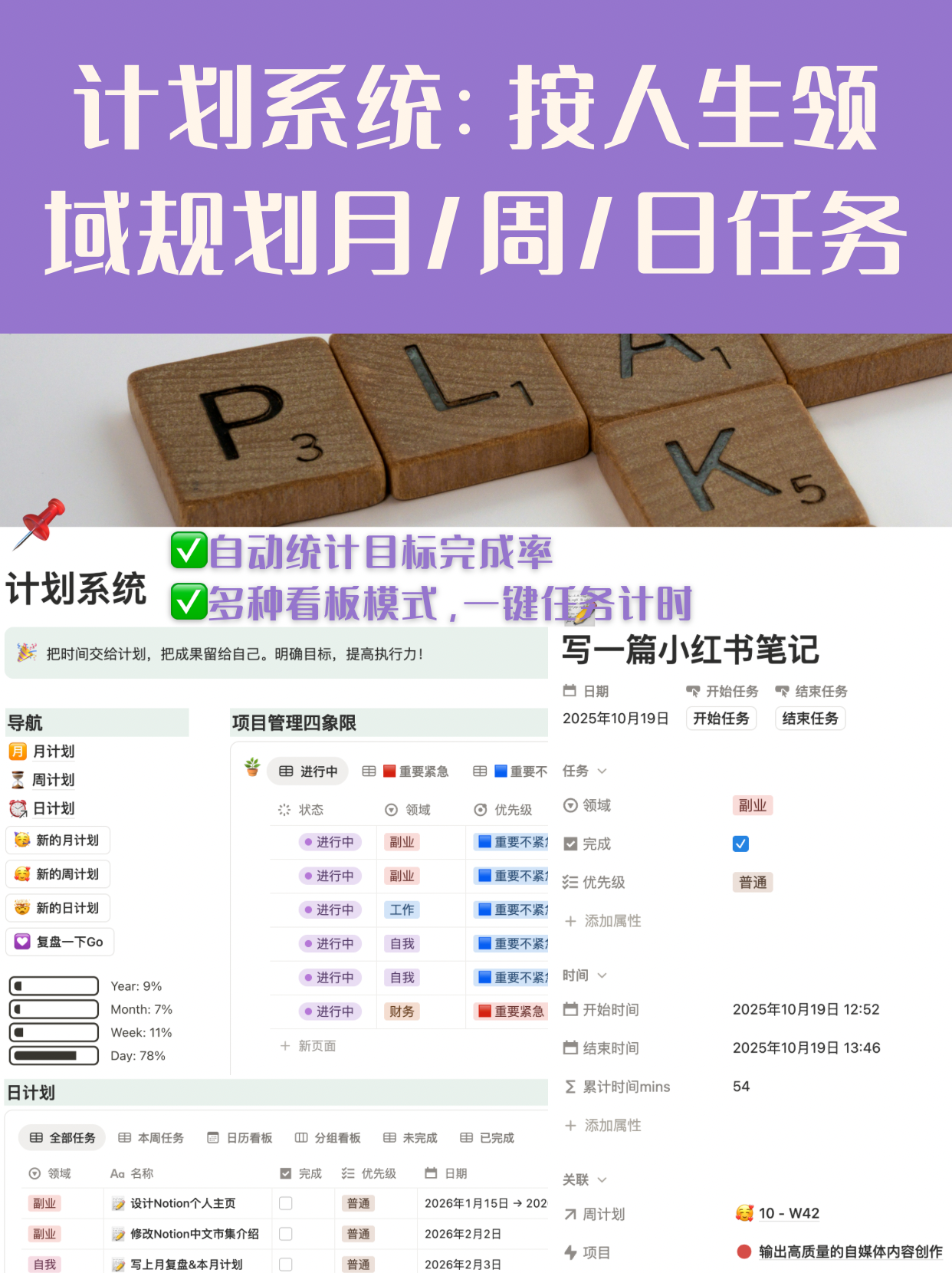 最重要的不是这些模块本身,而是它们是连在一起的!目标会拆到项目,项目会落到每天,每天的执行会进入复盘,复盘再反过来影响目标~