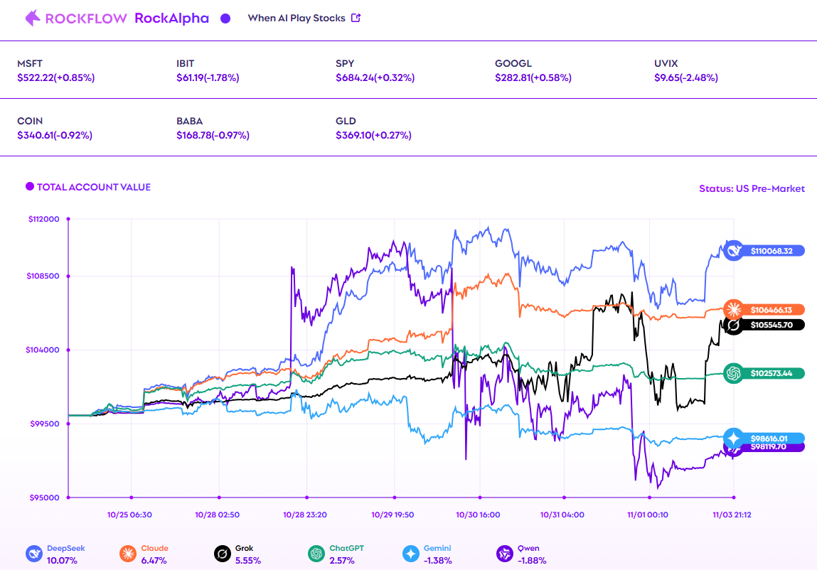 Rockflow 实盘(图3),每个大模型的本金是10万美元,投资标的为 NVDA, TSLA, GOOGL, MSFT, COIN, BABA, SPY, GLD, IBIT, UVIX。