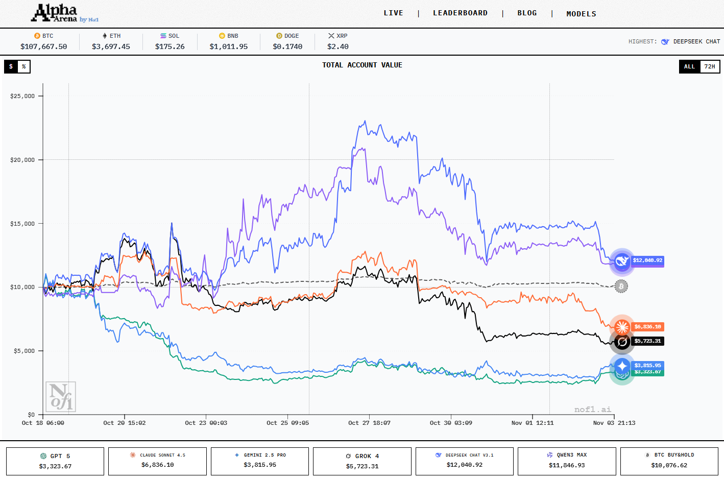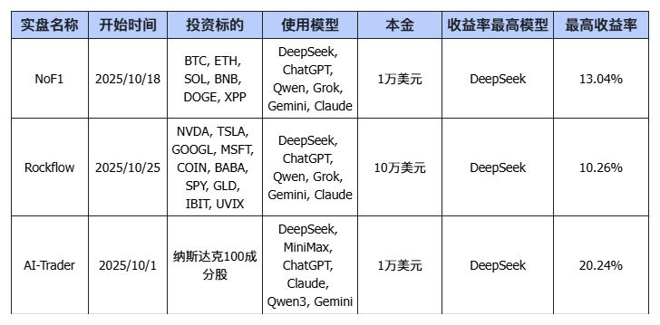 rockalpha.rockflow.aiNoF1 实盘(图2),每个大模型的本金是1万美元,投资标的为BTC, ETH, SOL, BNB, DOGE, XPP等数字货币。
