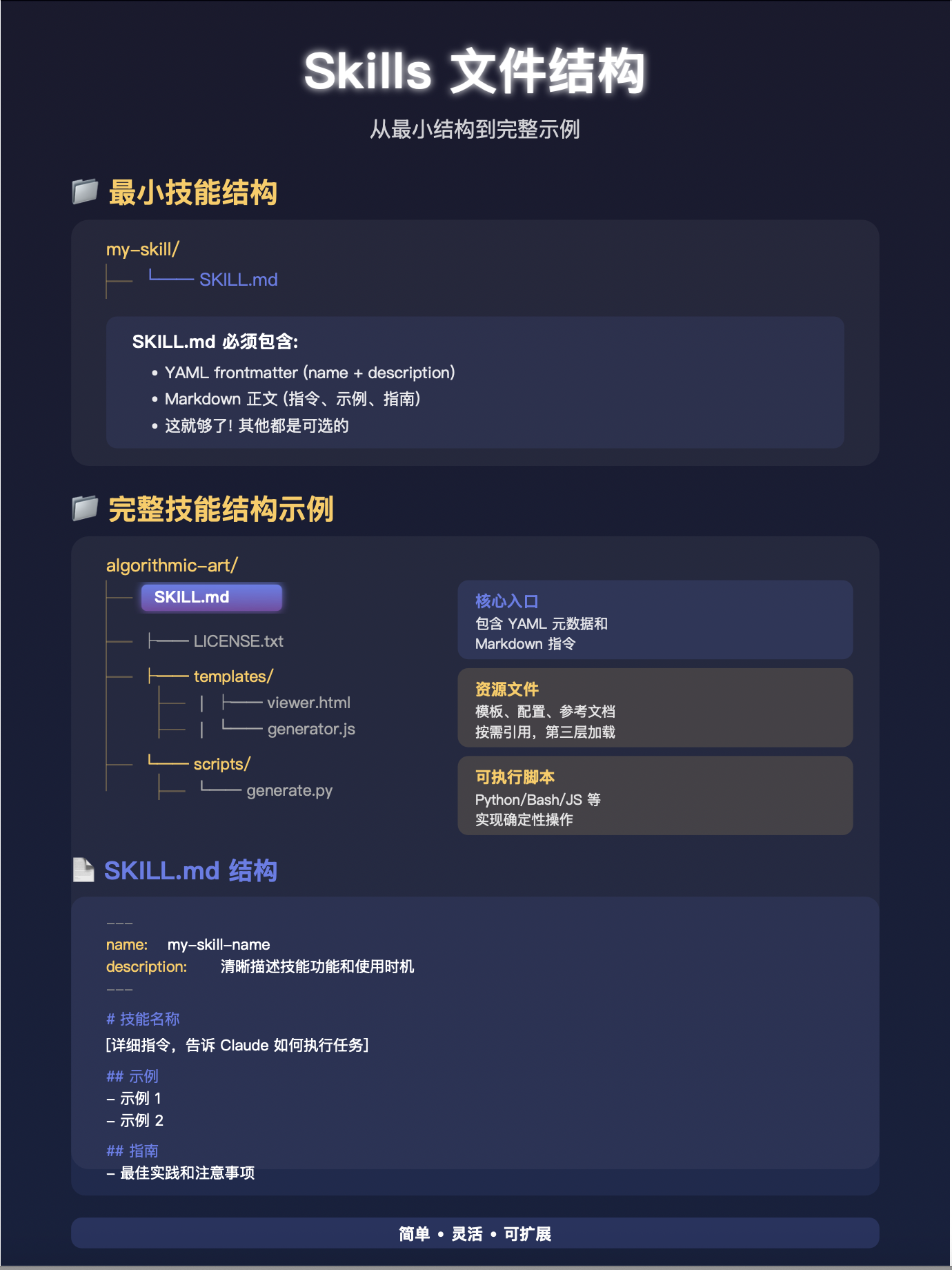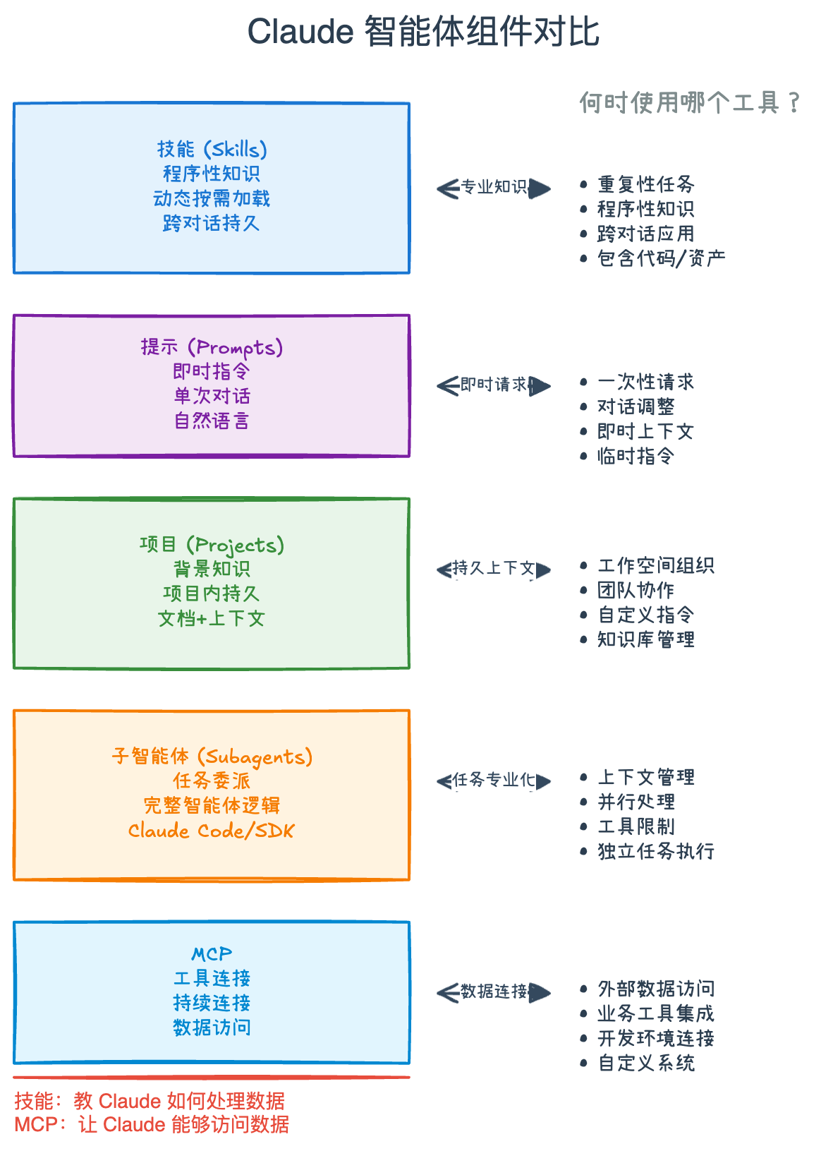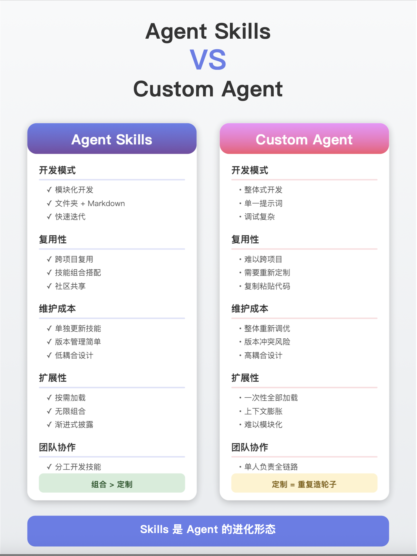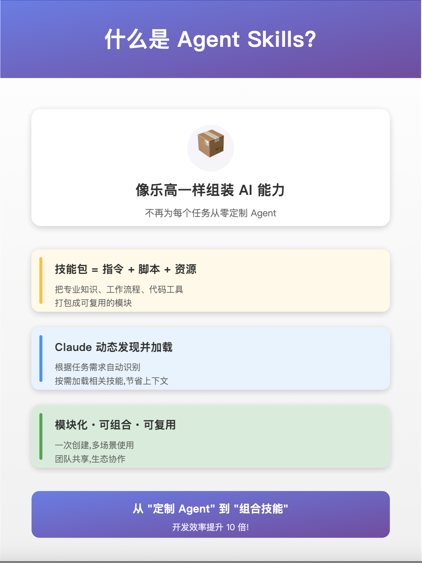 像给了一盒乐高,而不是一坨橡皮泥。不再需要每次都从头捏一个 Agent 出来。因为你可以把你的专业知识、工作流、甚至代码,都打包成一个一个的“技能”模块。用的时候,喊一声就行。