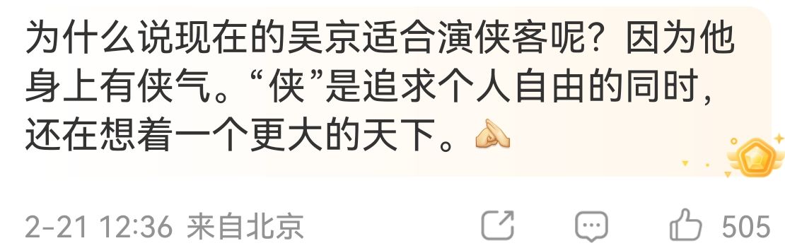 “比如谢霆锋扮演的谛听这条线,就极大拉深了文戏的深度。吴京扮演的刀马在道德上对谛听有愧,一个英雄要办事,但路上阻挡他的是一个自己愧对的人,该怎么办?这部戏的处理,是让刀马把刀透过自己身体插死谛听。事情我要办,这是信仰,但我愧对你,我可以让刀先插进我的身体,我可以陪你一起死,谁死谁活交给天意。这个处理太绝了。以后肯定要被其它电影反复借鉴。看到这的时候,我简直不敢相信编剧是俞白眉,果然合作牛逼的人,智商都能跟着涨。”
