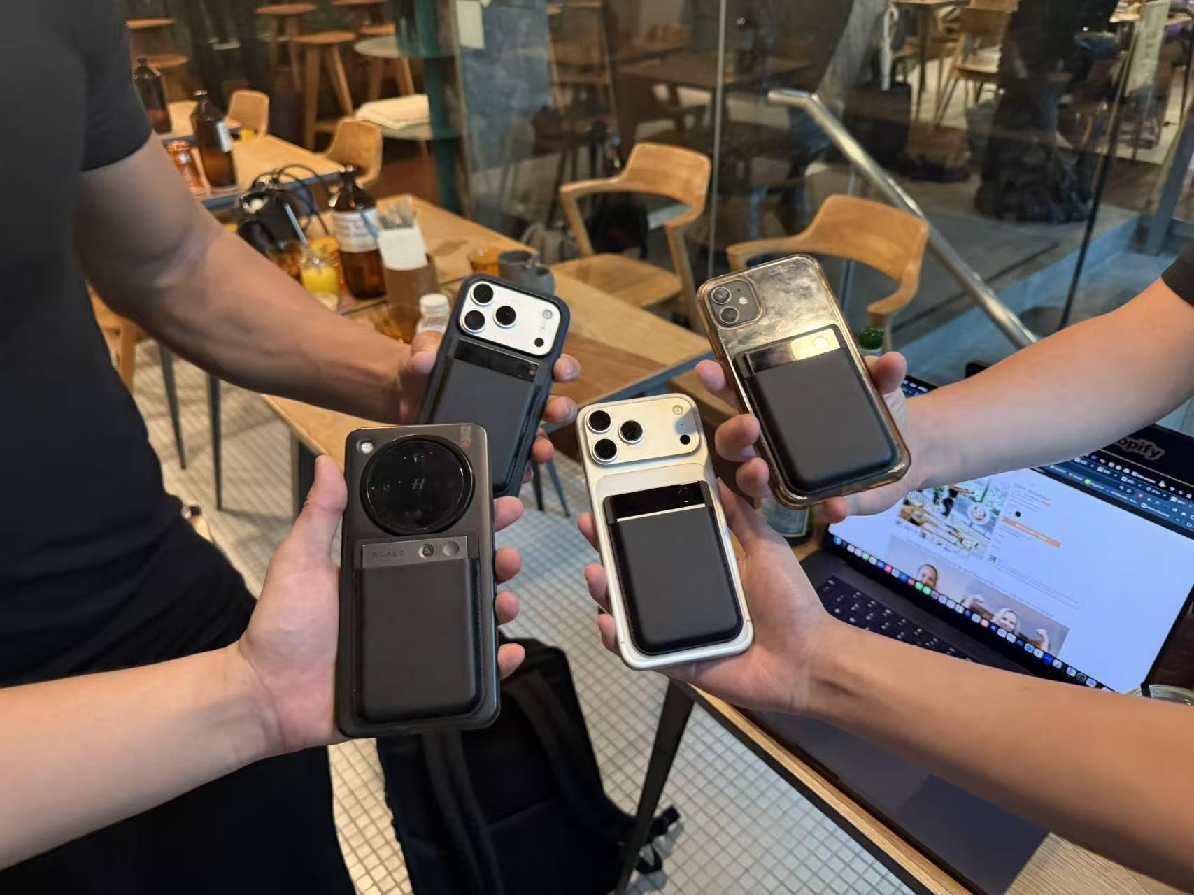 2.5观猹日记丨在咖啡馆偶遇了两位美国来的AI创业者,正在申请YC。介绍了观猹,并发现大家竟然都有Plaud,合影,并邀请他们之后来环球黑客松新加坡站玩。