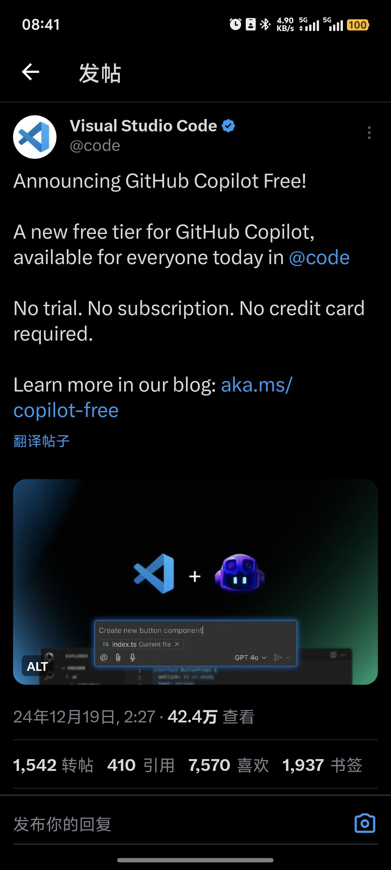 GitHub 日前宣布,其 AI 编程助手 GitHub Copilot 推出免费计划,现已在 Visual Studio Code 中向所有用户开放。用户只需拥有 GitHub 账户即可开始使用,无需信用卡或订阅流程。