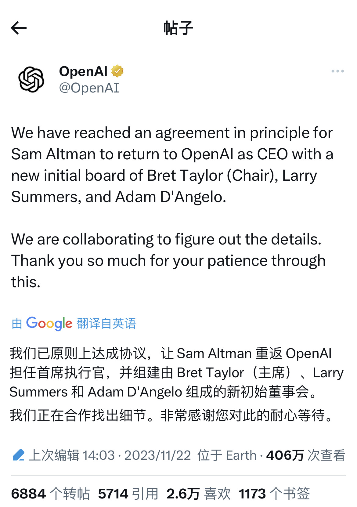 Adam D'Angelo:曾任 Facebook CTO、Quora 联合创始人和现任 CEO。此前他就是 OpenAI 董事会成员,并对解除 Sam Altman 的 CEO 职位的决议投了赞成票。