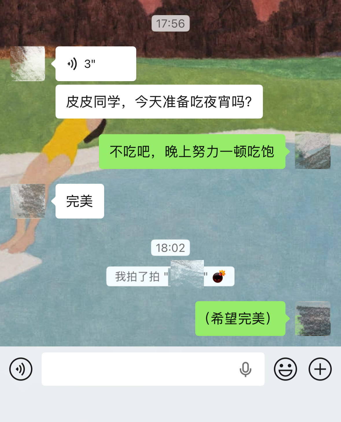 中午下课时他问过我一遍。我想了想,说,我说不好,因为在吃上,我未来的自己完全没有把握。且按历史经验来看,我天天翻车。我现在只确定一件事,当我晚饭饱得能把自己撑死,我就不会吃夜宵。