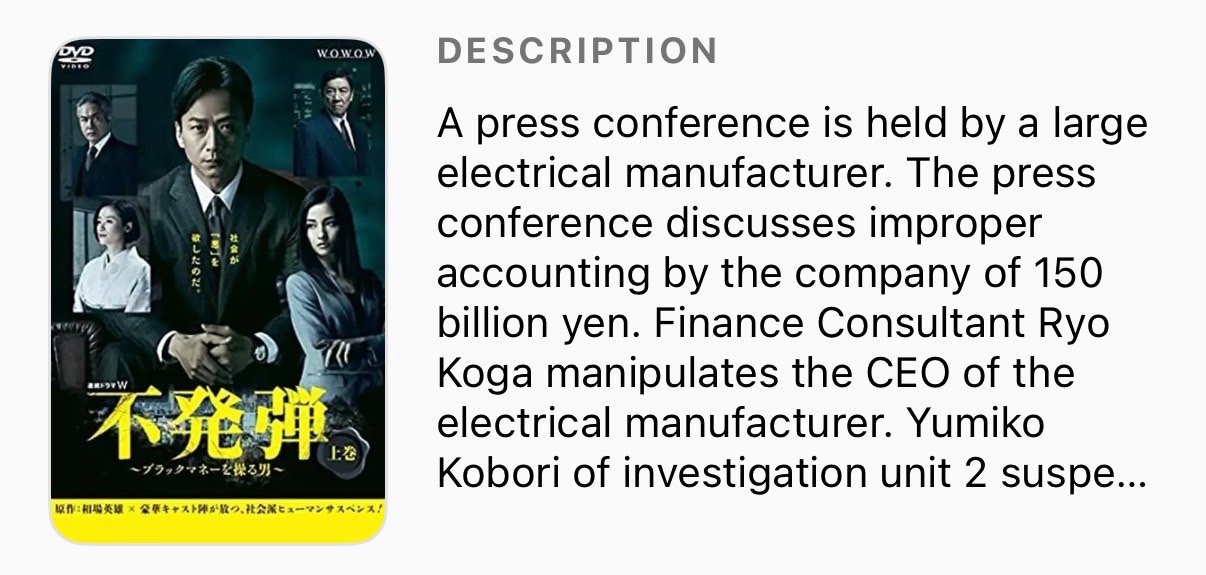 《隐患 ~掌控黑钱的男人》,评论说在影射日立事件,挺有意思的剧。