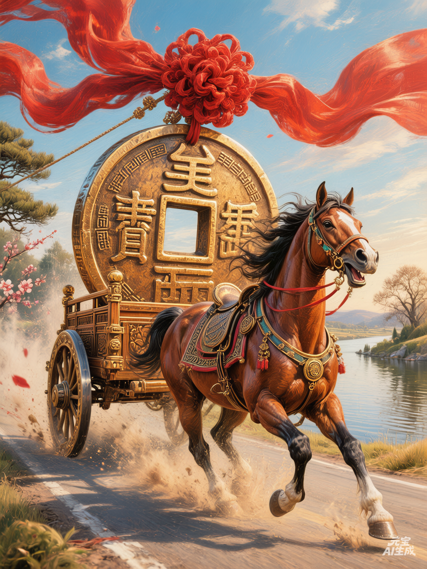 「马跃祥云衔春至,铜钱系红贺马年」