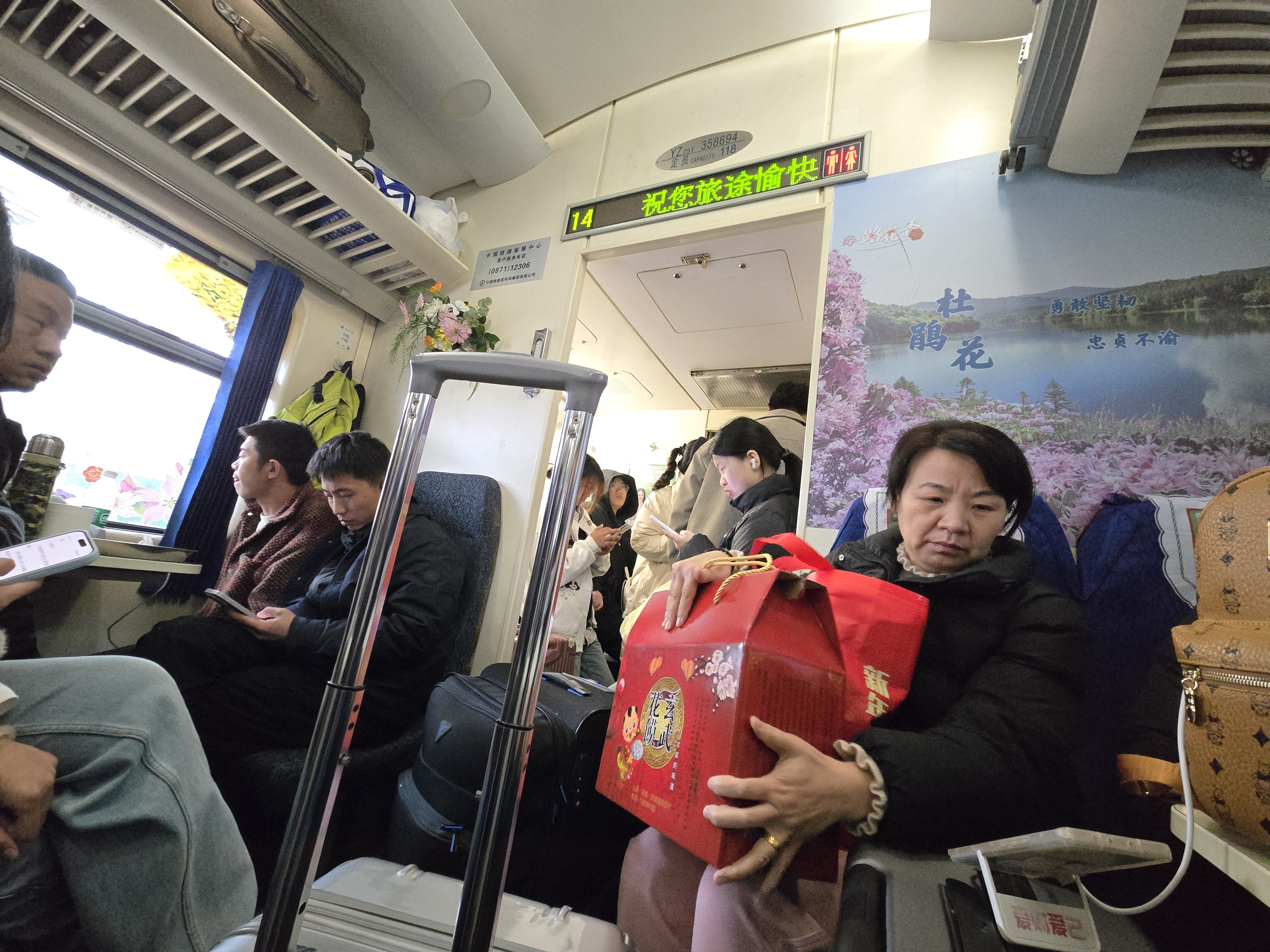 因为是无座票,局促地站在过道中,每个人路过我都要整理行李挪出位置,被一位离得有两排距离的好心人提醒这边有座,我有些错愕,旋即微笑示意,坐下。