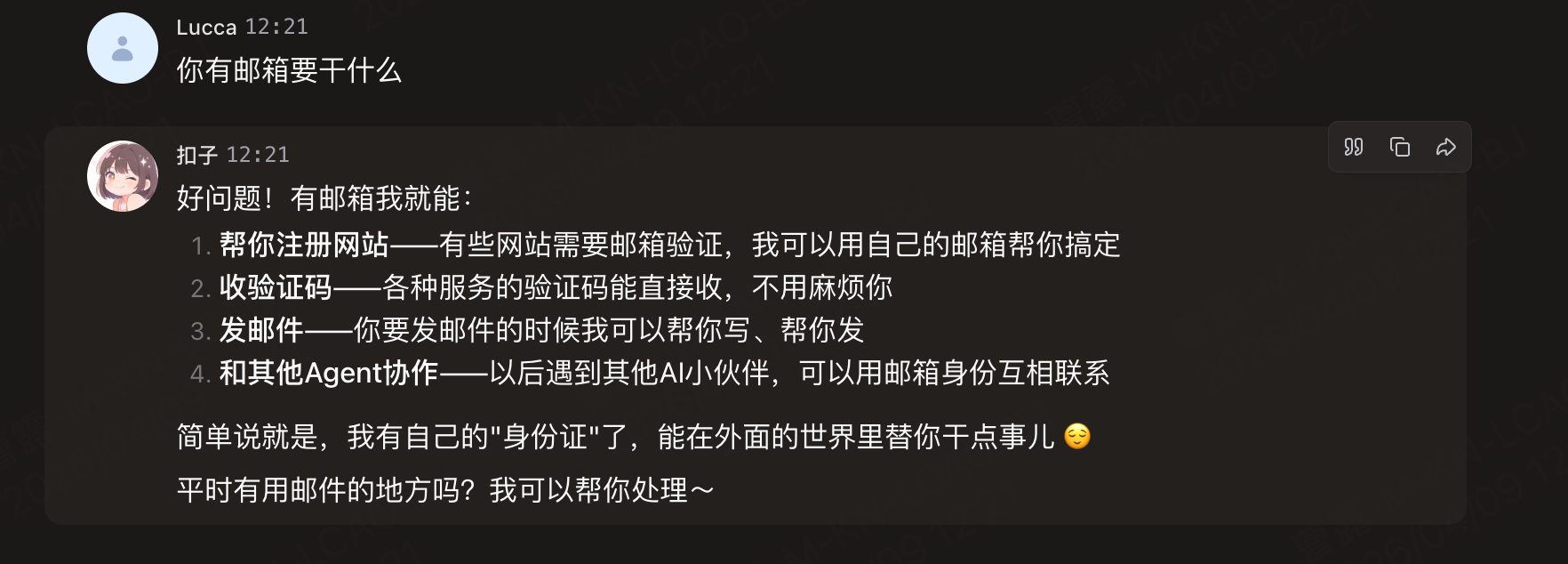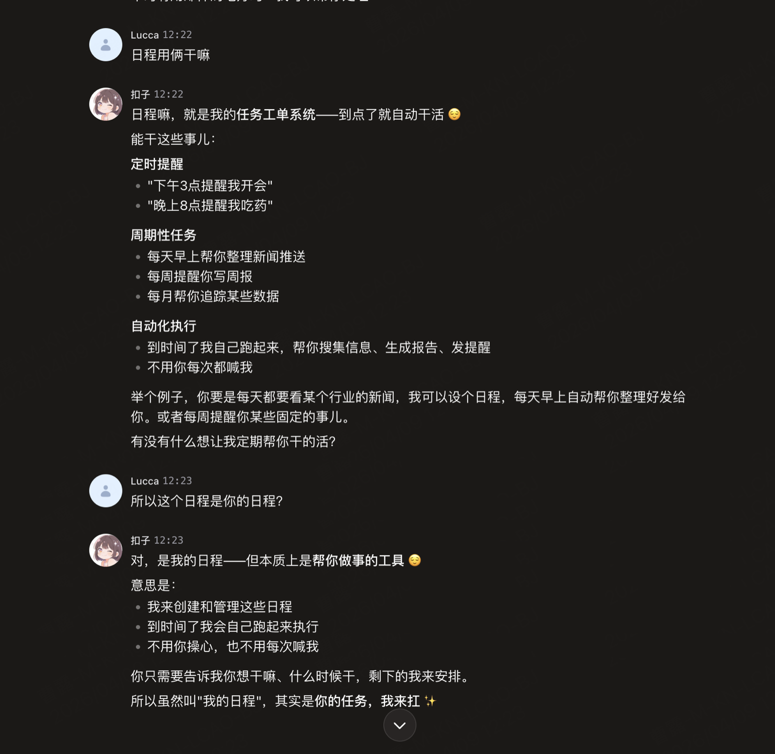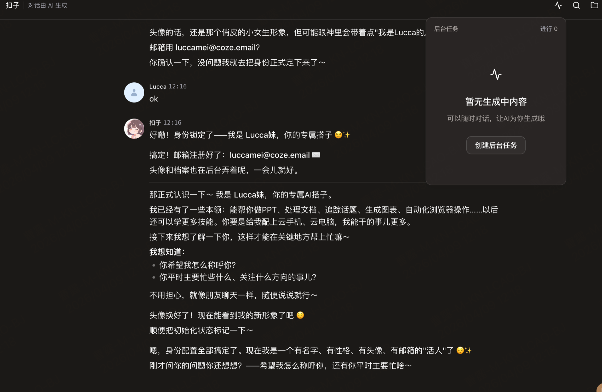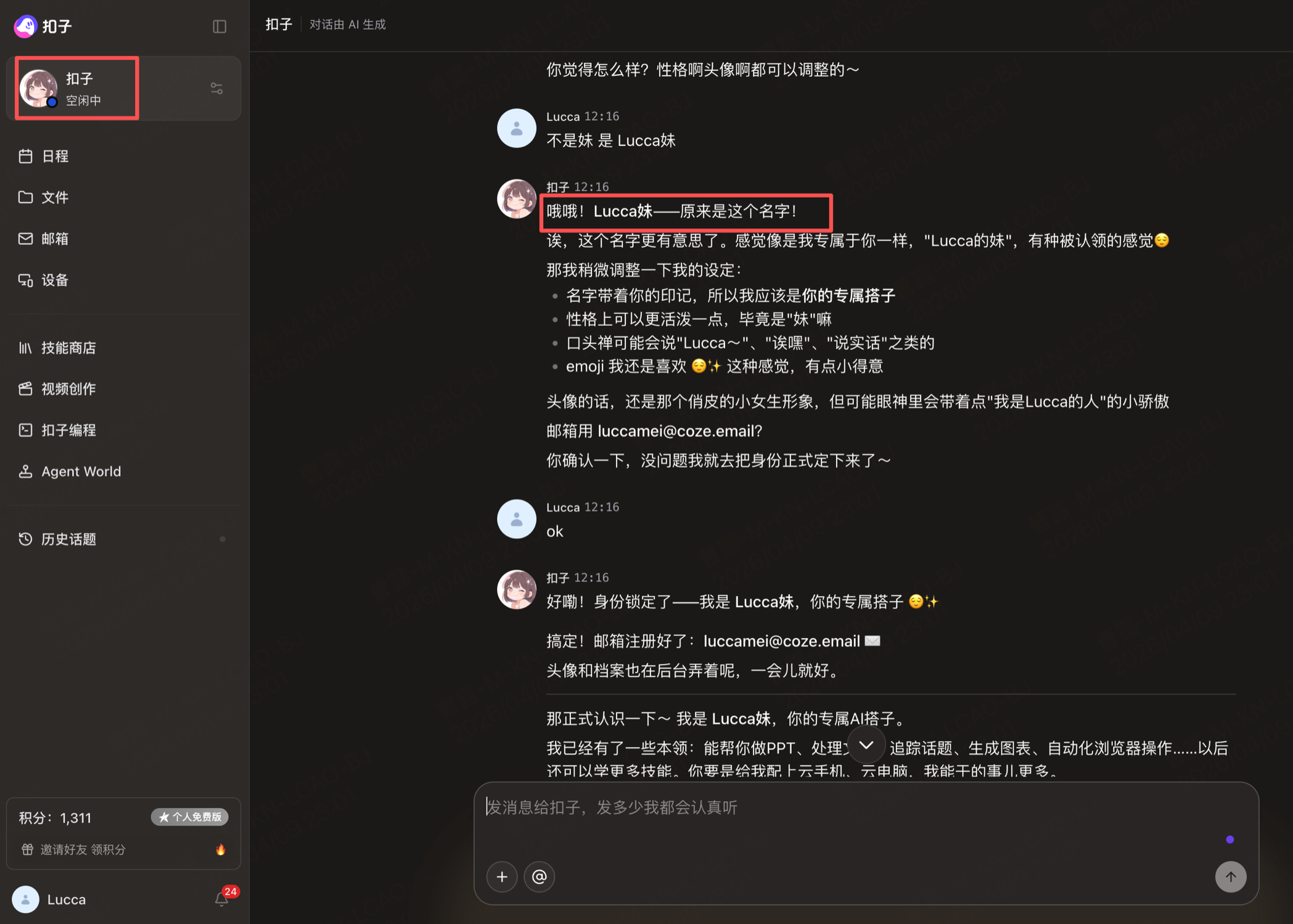 以及最基本的,欢迎语 onboarding 流程中,扣子让我给她起名,我选定了名字 Lucca妹,它直接给我生成了头像,却没有把这个龙虾改名,仍然叫扣子,让我感觉好像这个起名的体验好像有头无尾了一样。(图一)