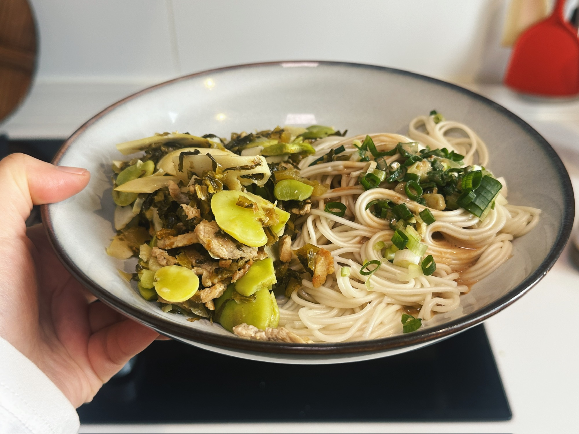 春笋雪菜肉丝蚕豆浇头,配上花生酱拌面,关键还需要一撮鲜榨的花椒油滋啦啦在葱末上~