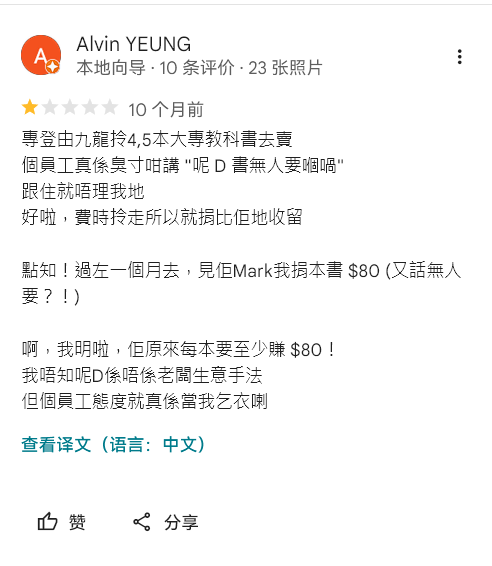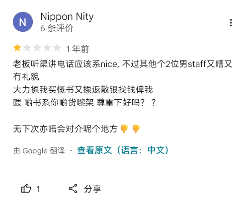 春节的时候去香港,基本上所有港人我感觉都很友善,除了一家书店的老板跟傻逼一样,对我很凶。今天闲着没事突然想起来去 Google Map 看看评价,笑晕了