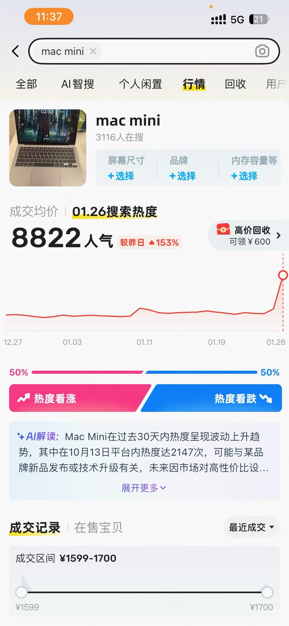但从某鱼市场,虽然Mac Mini搜量涨, 但价格并没有暴涨太多,其实按照使用门槛不低, 还是小范围的AI爱好者的玩具