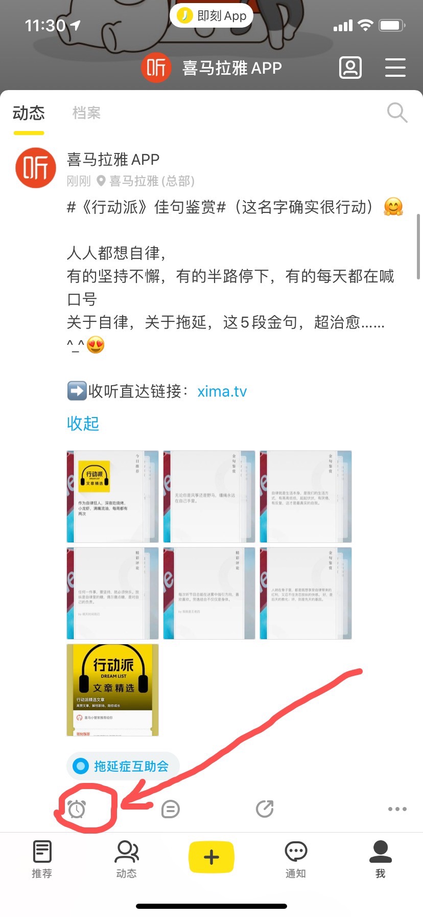 『拖延互助会』圈子的动态,‘点赞’功能的按钮竟然是闹钟⏰图标,响应圈名,太可爱了叭🤟🤟🤟