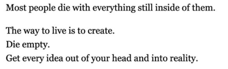 今天刷到这个Die empty的想法,挺有意思。大部分人死之前脑子中还有很多没有完成的事情,而我们其实可以在有限的生命中,努力创造,把大脑里的想法都变为现实,从而让自己空着离开。其实就是:倾其所有,不枉此生。