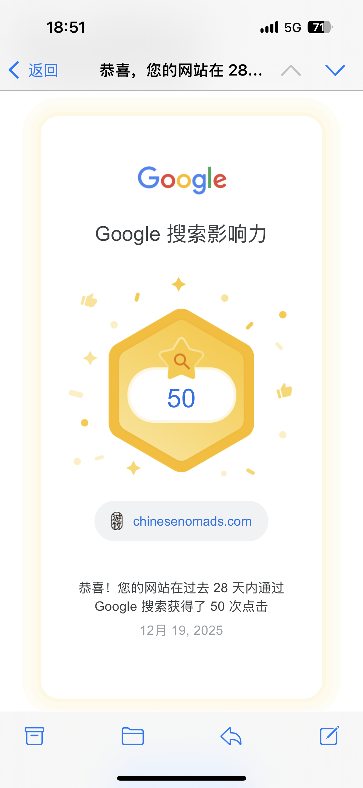 官网获得50次搜索点击了,Google送了小牌牌😂