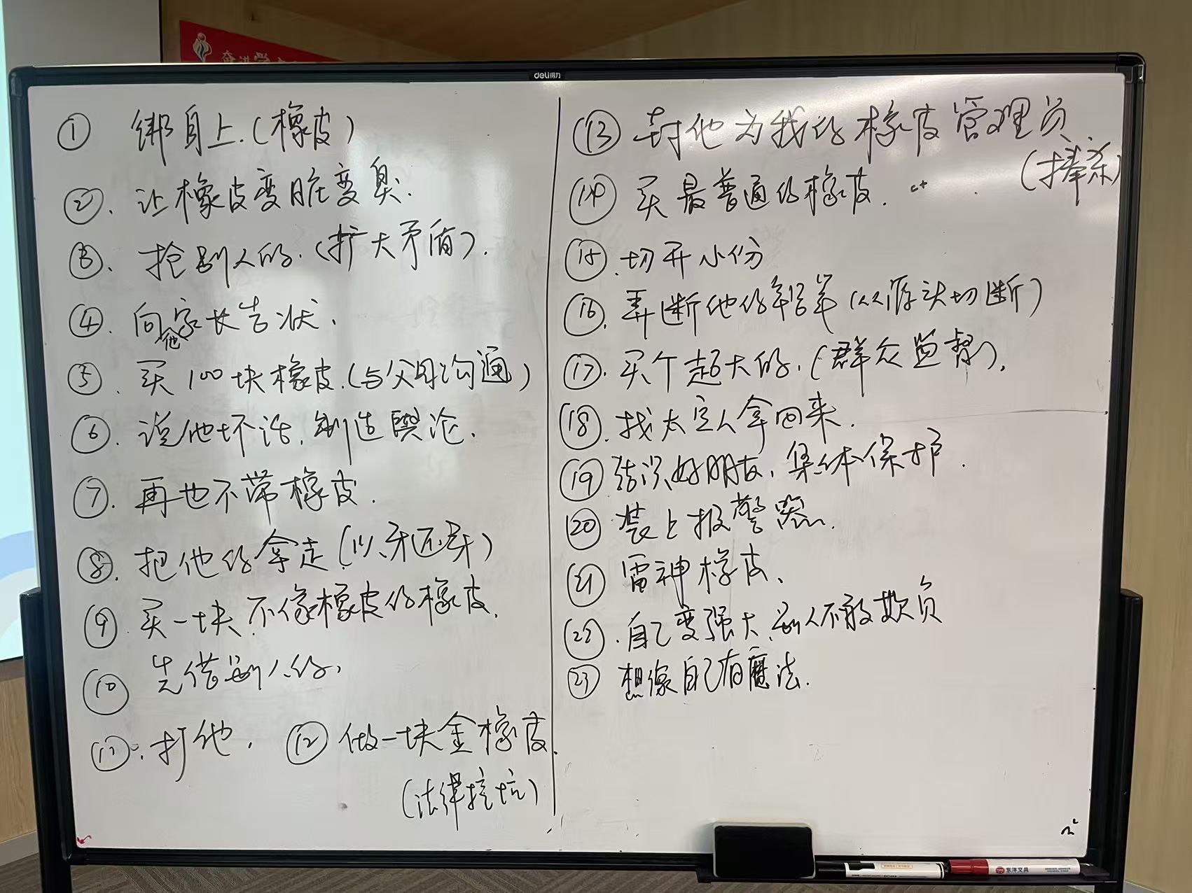 然而自己想来想去,无非就是告诉爸妈、或者告诉老师这种常见的办法。没想到其他人能想出满满一版答案,甚至有人说可以带一块像雷神之锤一样的橡皮擦,只有雷神自己能拿得住。