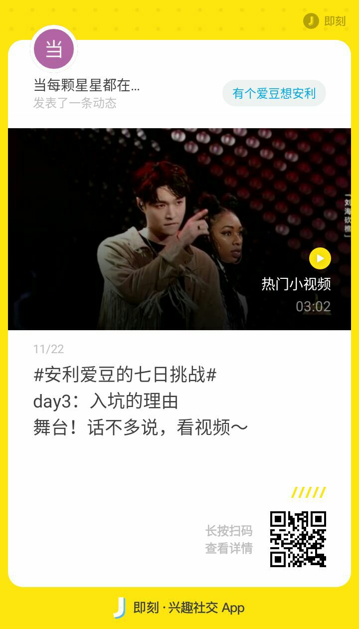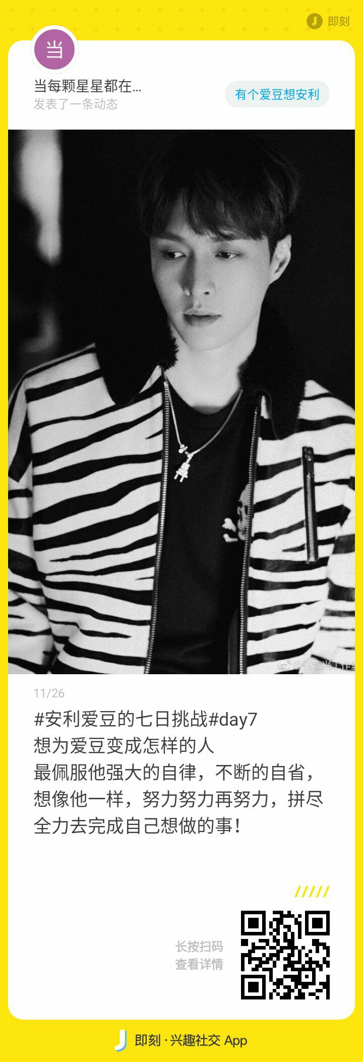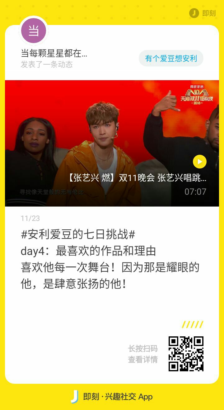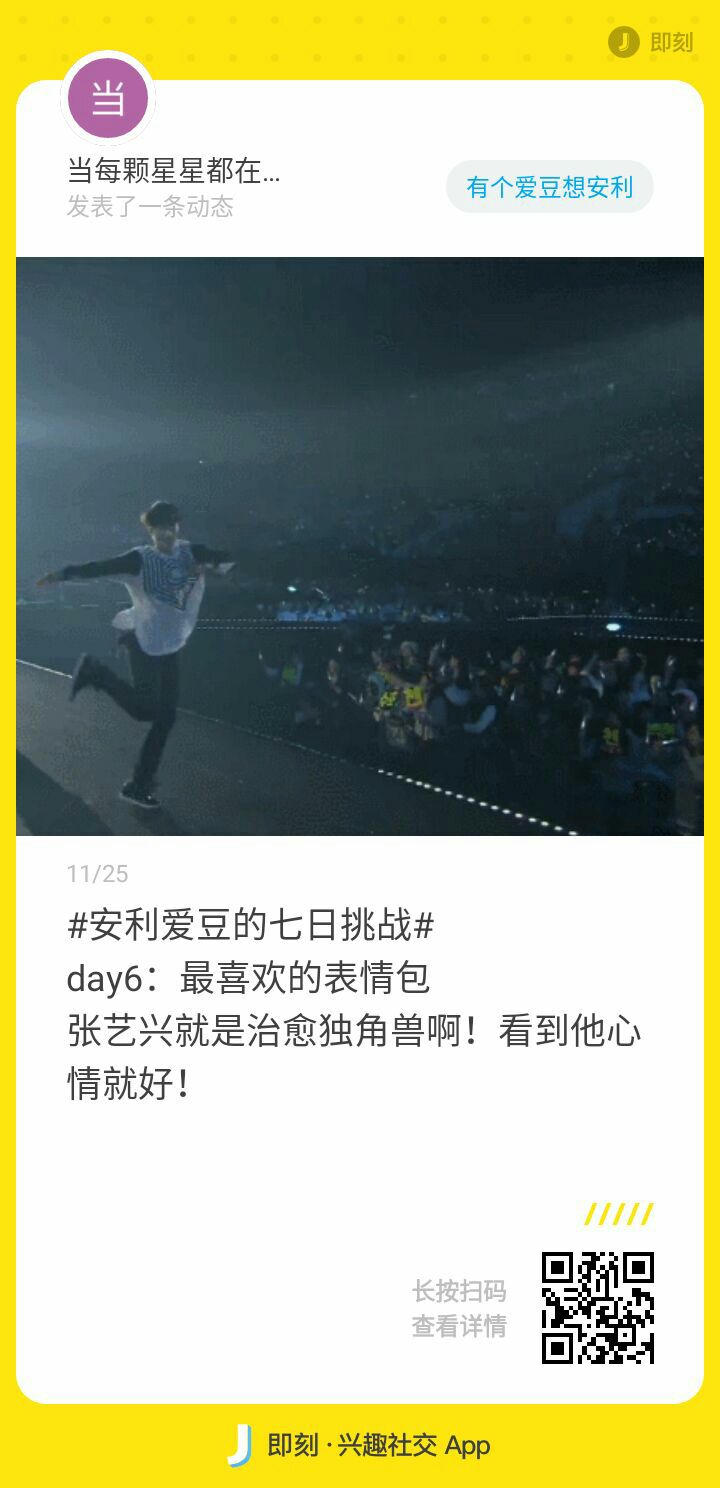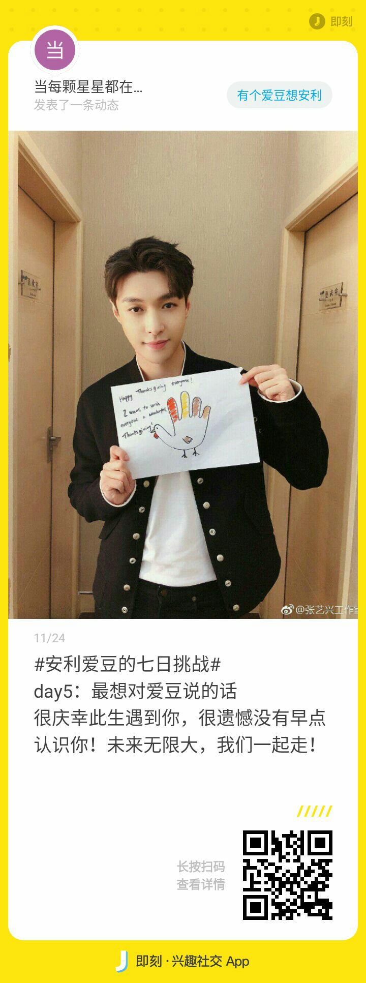 当每颗星星都在闪光发表了动态:#安利爱豆的七日挑战# day5:最想对爱豆说的话 很庆幸此生遇到你,很遗憾没有早点认识你!未来无限大,我们一起走!