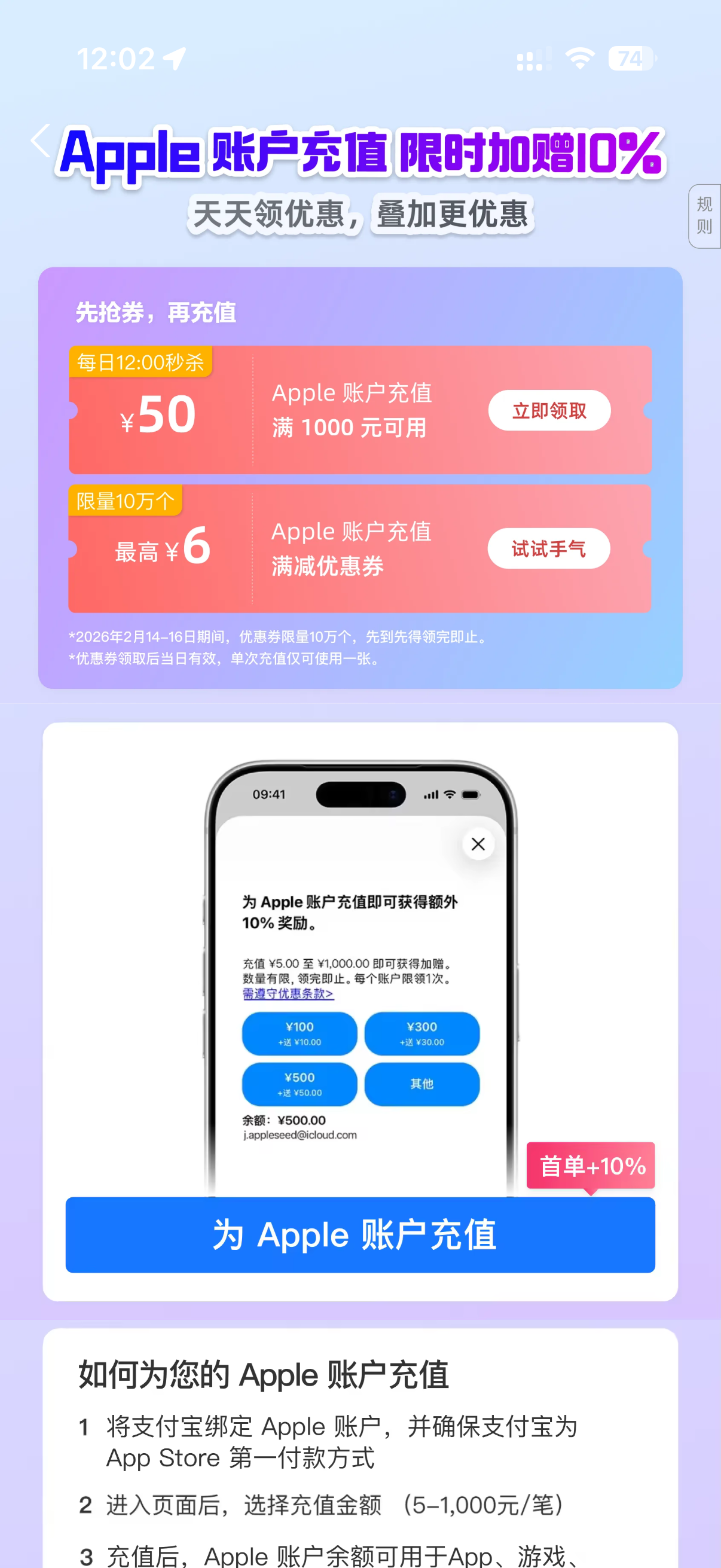 支付宝这个Apple充值抢券活动是骗人的吧!都已经过12点了,还是敬请期待🙄