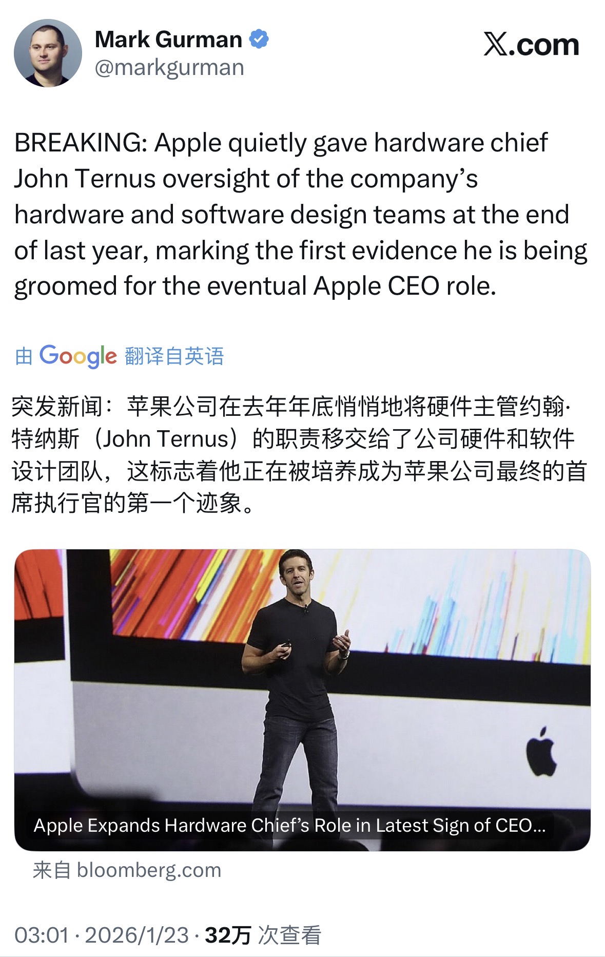 看好 John Ternus 当下一任 Apple CEO