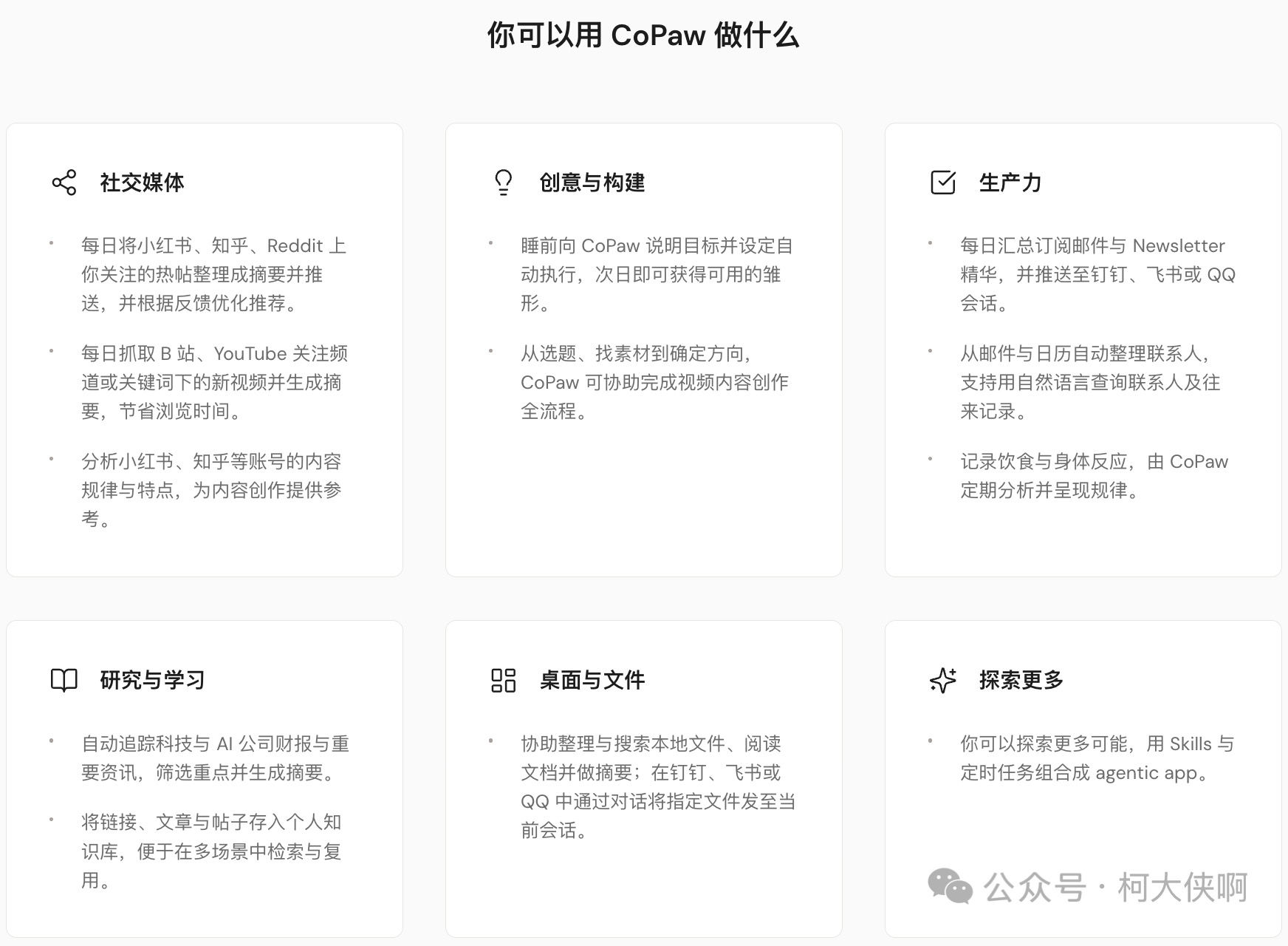 那CoPaw具体能帮你干什么呢?如图3所示,可以帮你管理社交媒体、创作内容、收发邮件、管理个人知识库、管理本地文件等等。