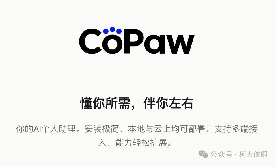CoPaw由AgenScope团队打造,定位是一只随时准备帮忙的温暖「小爪子」,是你数字生活中最默契的伙伴。
