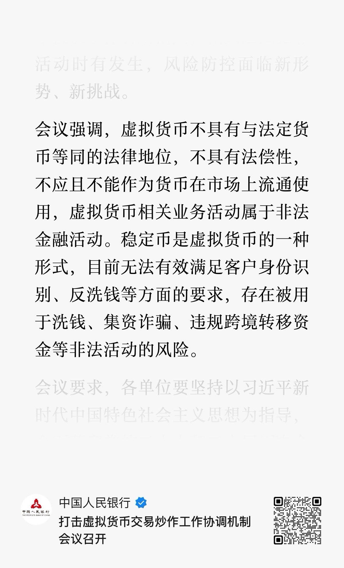2025年11月28日,中国人民银行召开打击虚拟货币交易炒作工作协调机制会议。