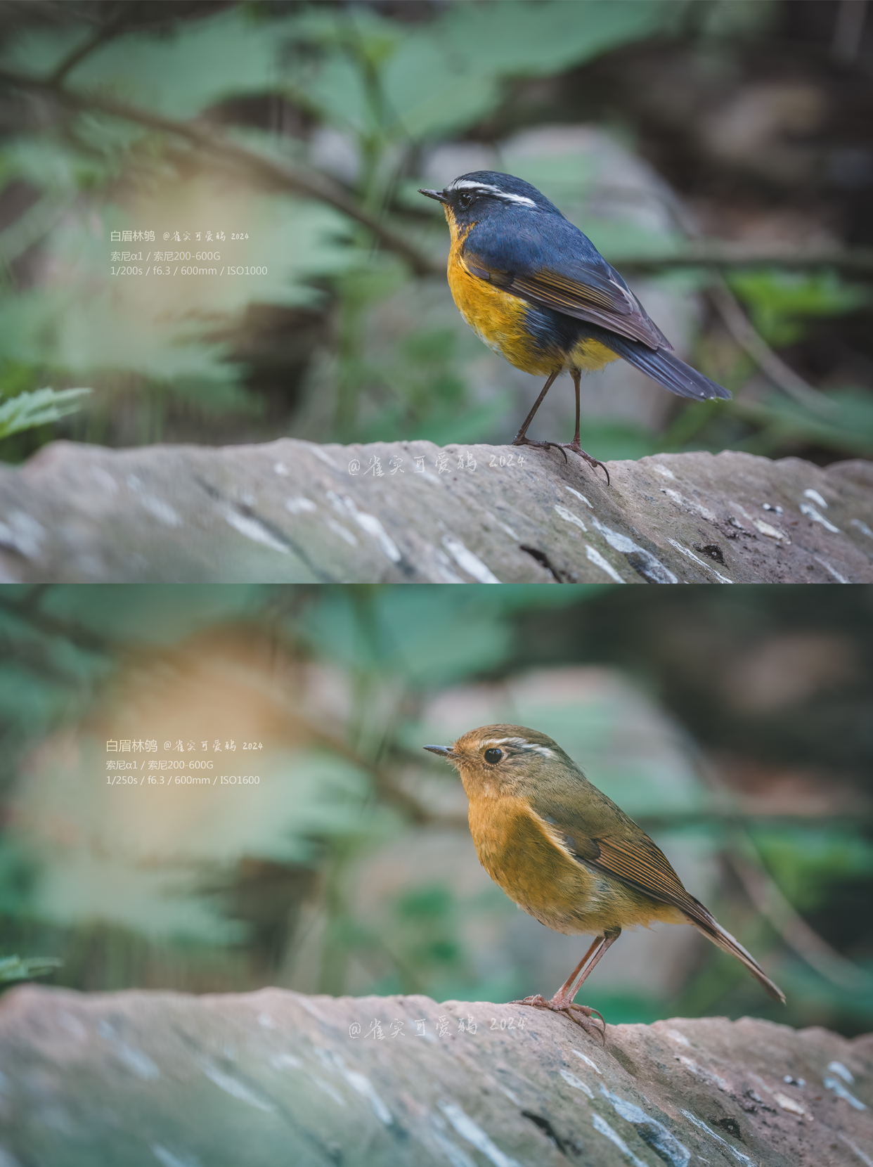 这是密林中的一对白眉林鸲(qú)雌雄鸟,它们是即将到来的繁殖期伴侣。众所周知,自然界中大多数鸟类的雄鸟羽色更鲜明醒目,所以暗蓝色的是雄鸟,暗黄色稍显朴素的是雌鸟。