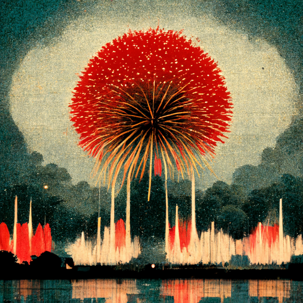 想让Al画 Japanese festival fireworks, 本来预期的是类似日本夏日烟火节的绚烂场景,或者是日漫风格的烟火盛会。
