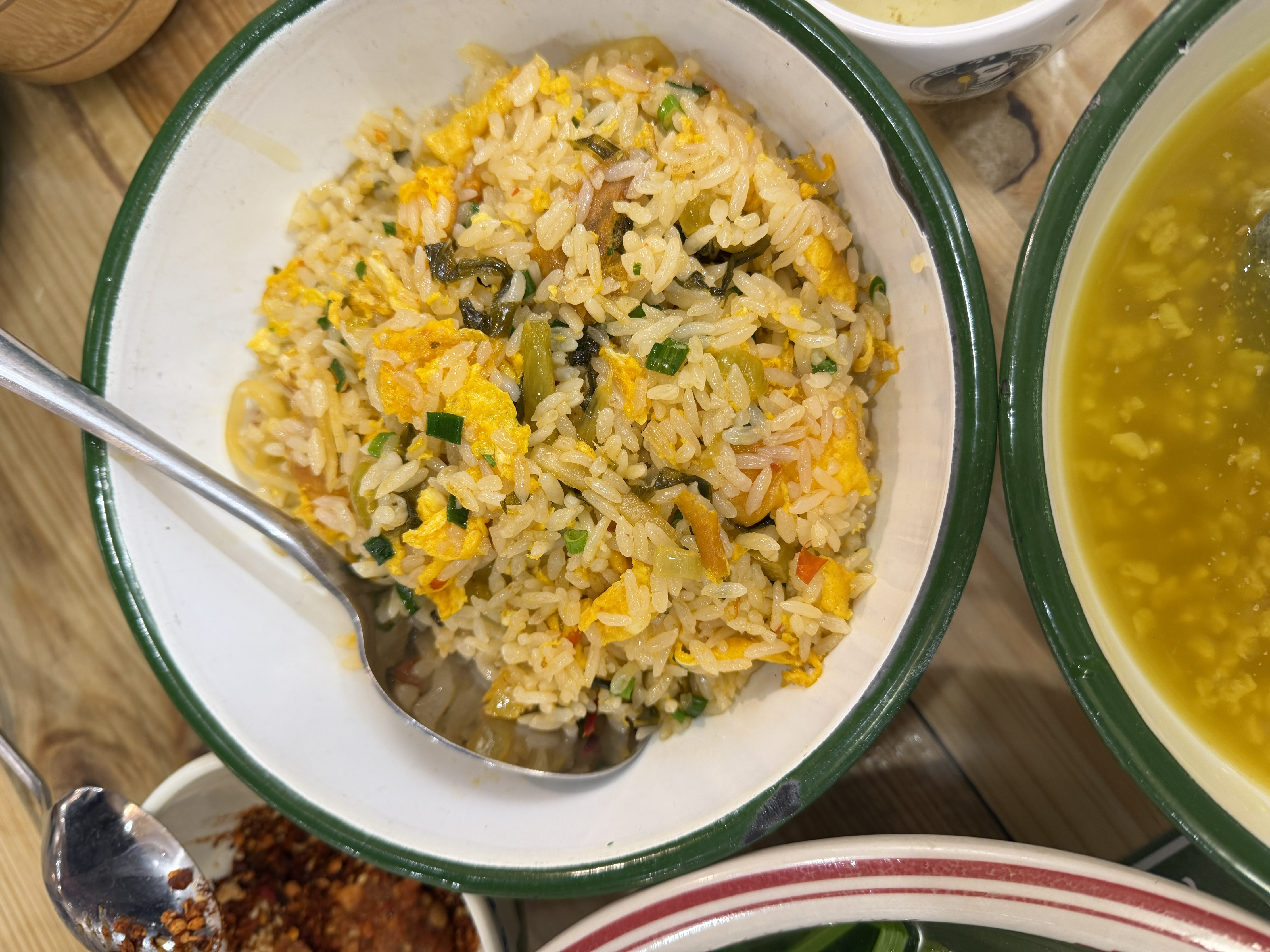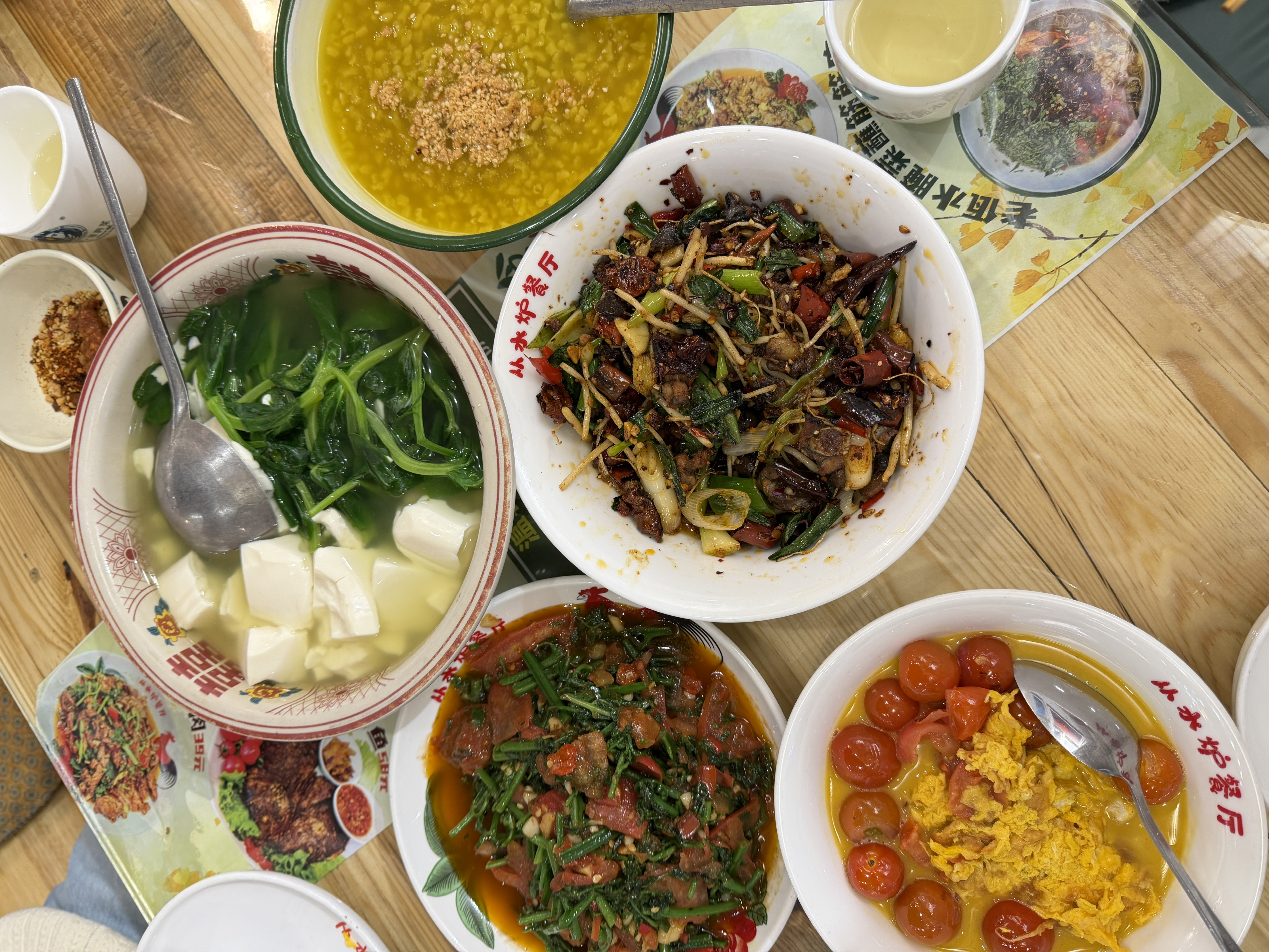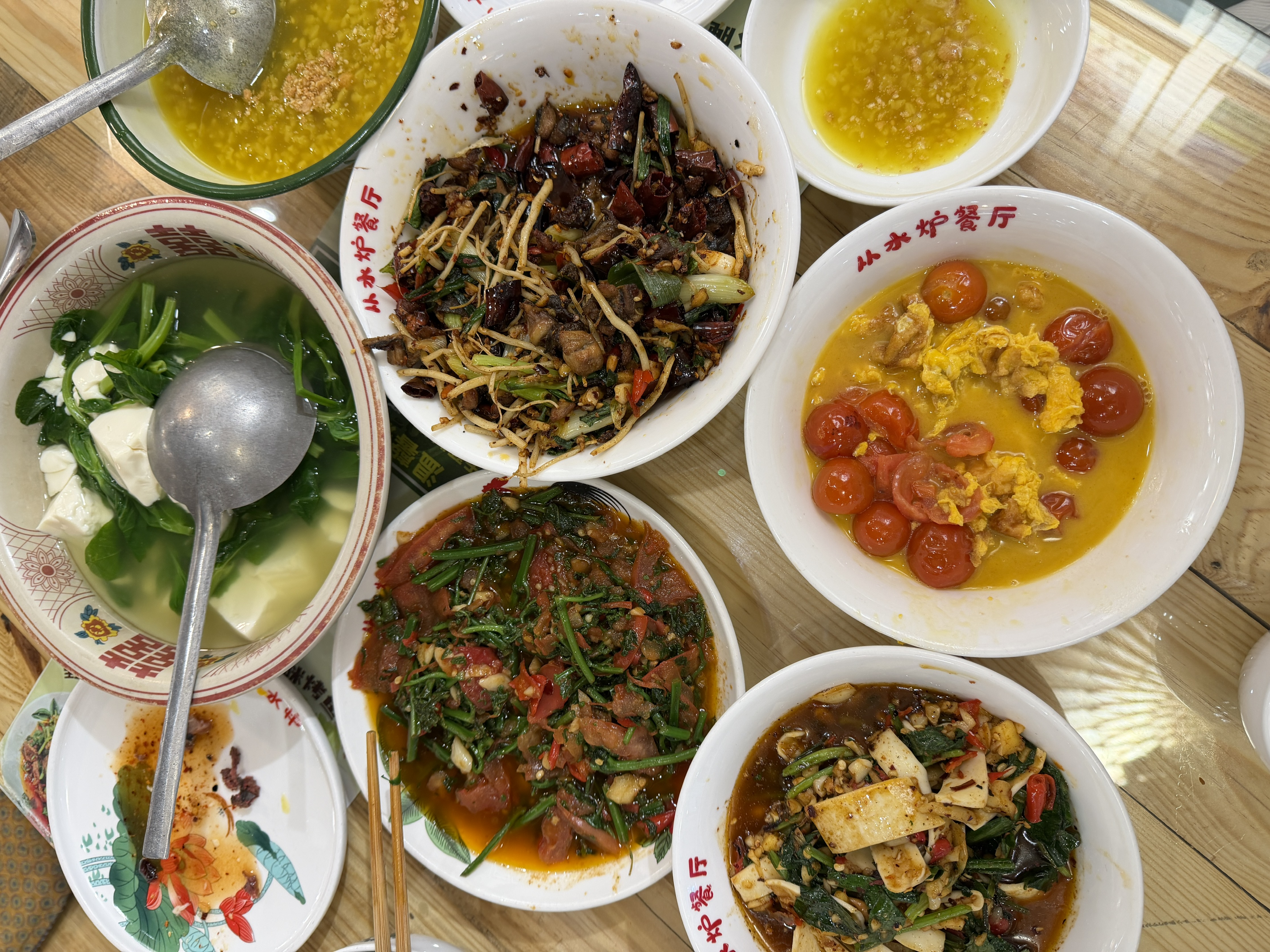水蕨菜是几家里炒的最嫩最好吃的,普洱小炒鸡调味丰富,必点。香料炒黄喉和牛肉都非常下饭,盲点不出错。野番茄炒鸡蛋不是热门但是也太好吃了,本人番茄鸡蛋狂热者,鸡蛋炒出了童年的味道。腌菜鸡蛋炒饭不用多说香喷喷,只是油多。冰稀饭算是甜品,里面加了蜜蒙花,味道挺特别的,解腻好吃。