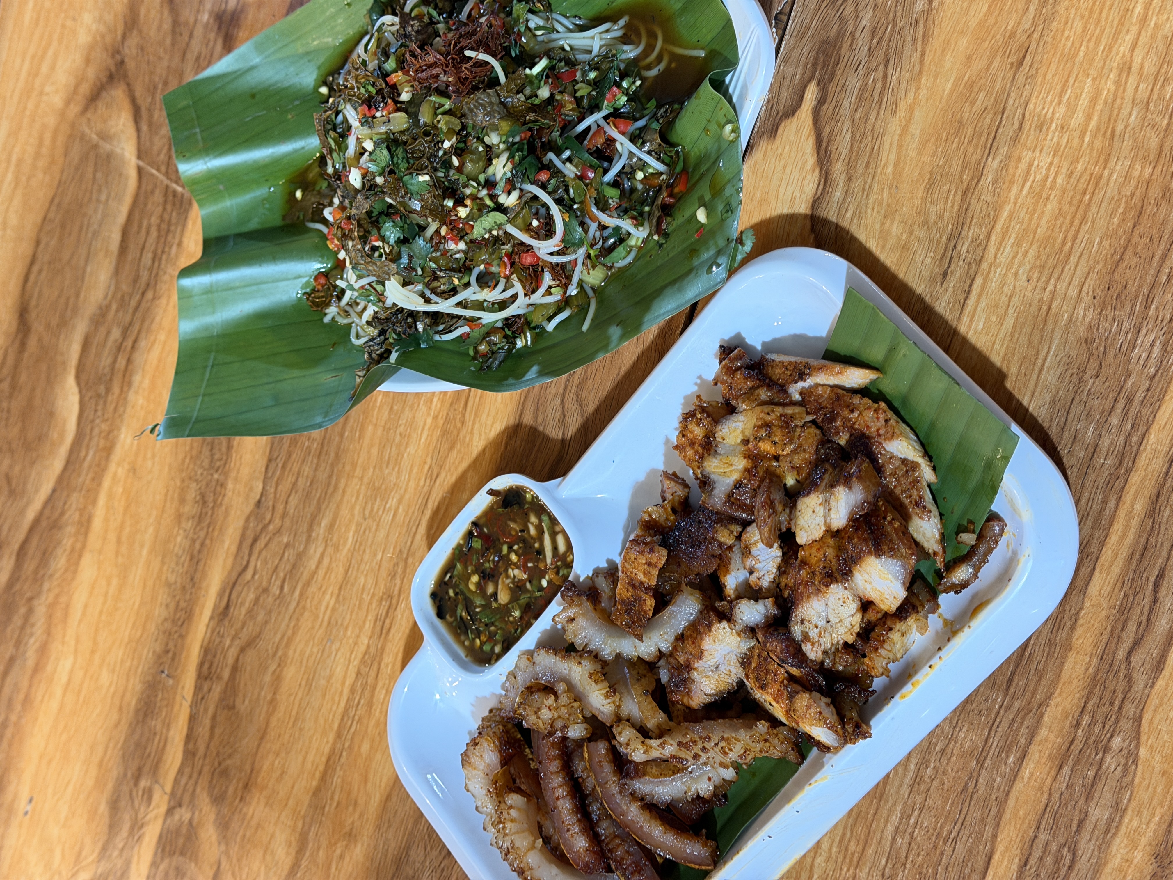 昆明朋友力荐,排队最慢的一家,但是也值了吧。烤土猪肉拼肉皮,怎么能烤的这么香嫩有味。鸡肉烂饭本来不打算点分量实在太大,也在其他家吃过,但是来都来了还是点了,里面大块的乌鸡肉,茴香叶伴着脆脆的茴香根,味道简直天壤之别,太赞了。酸芒果炒牛肉沫也不必说,下饭神器。最想尝的野番茄罗非鱼已卖完略惋惜。