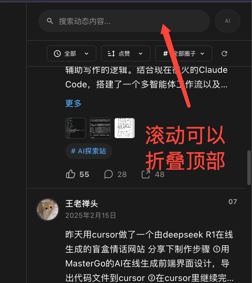 王老禅头: 作为即刻的重度用户,我一直觉得网页端还能更好用一些。于是我做了这个「即刻侧边栏」浏览器插件,现在免费分享给大家 🎁 安装后会在即刻网页右侧自动显示智能侧边栏,UI和即刻风格完全一致,明暗主题自动切换,设计了高效的弹窗交互 ━━━ 📊 动态管理 智能侧边栏 自动抓取并展示当前页面的所有动态,支持按点赞数、评论数、发布时间等多种方式排序。 可以按圈子分类、时间范围、动态类型组合筛选。 双模式搜索 · 普通搜索:传统的精确匹配,快速定位包含特定文字的动态 · AI语义搜索:理解搜索意图,智能匹配相关内容。 ━━━ 🤖 AI助手 -AI对话 基于博主动态内容的智能问答系统,三种对话模式: · 当前动态对话:分析正在浏览的博主内容,回答相关问题 · AI分身对话:自动学习博主风格,生成博主的AI人设进行模拟对话 · 自定义范围对话:指定时间或圈子范围,搜索相关内容后回答 支持:推理、动态图片识别、联网、快捷指令 -AI洞察分析 AI分析博主动态,自动归纳主题和关联事件,生成结构化洞察报告。 -AI时间线 将博主的动态转化为即刻时间线,帮你快速了解博主的人生轨迹和变化。 -AI关注日报 智能筛选关注博主动态,按主题生成专题摘要。 -AI博主数据分析 互动热力图、圈子分布、发帖节奏等可视化统计,生成对应AI报告 ━━━ 📤 导出同步 -多种格式文件导出 支持PDF、PNG、Excel、CSV、Markdown、TXT、JSON等7种格式。 -第三方同步 一键同步到飞书多维表或Notion数据库。 ━━━ 🚀 快速开始 Chrome商店安装地址:https://chromewebstore.google.com/detail/%E5%8D%B3%E5%88%BB%E4%BE%A7%E8%BE%B9%E6%A0%8F-pro/loajpeecoeefjgndidfnalbkfofijkoi?authuser=0&hl=zh-CN 使用教程:https://deygt3n09r.feishu.cn/wiki/MqQ2wSg4ui0oHvkKZR2c3hadnGb 详细功能介绍:见配图