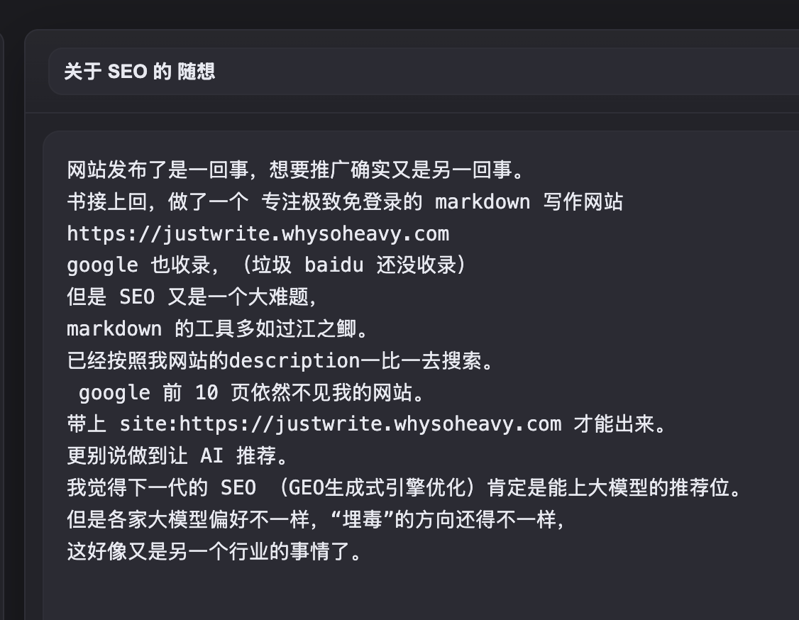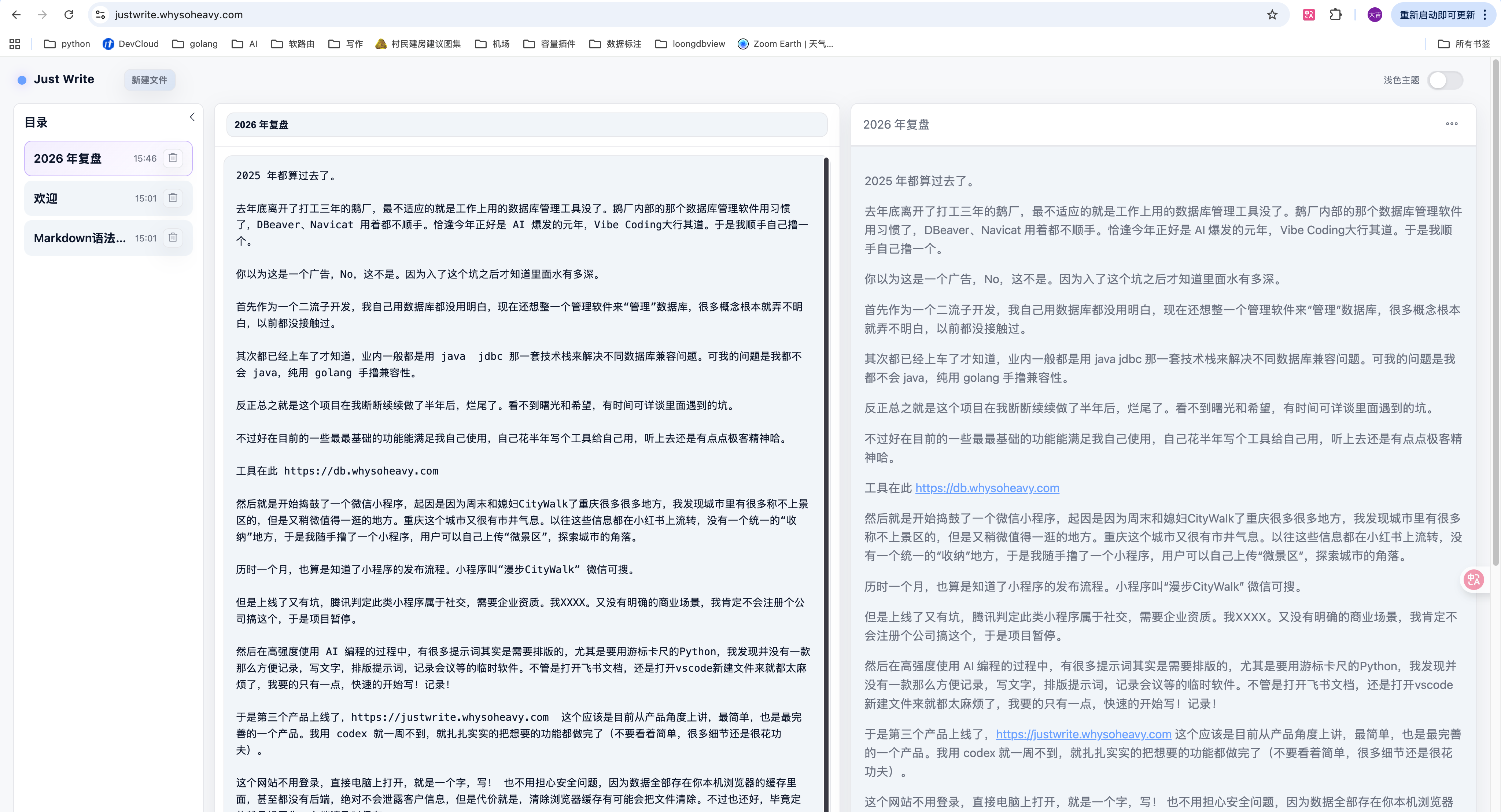 justwrite.whysoheavy.com 这个应该是目前从产品角度上讲,最简单,也是最完善的一个产品。我用 codex 就一周不到,就扎扎实实的把想要的功能都做完了(不要看着简单,很多细节还是很花功夫)。