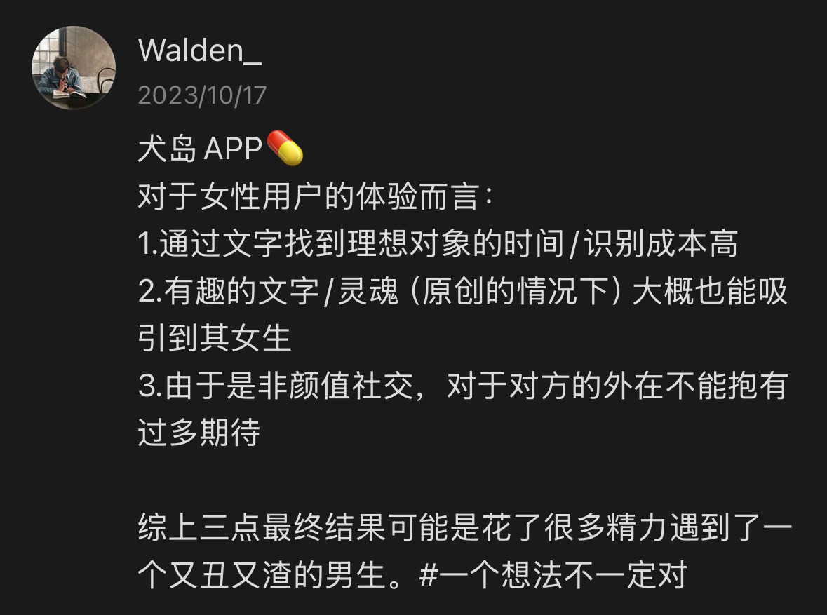 最近20条带图动态没有自拍且标签为单身的男性即刻用户,基本是两性交友市场上最最最底层的一类,可能在事业上小有成就,但是一定在颜值、身高、身材、发际线有严重硬伤。 在文字社交软件即刻搞mindfuck那套,真是太差劲了。