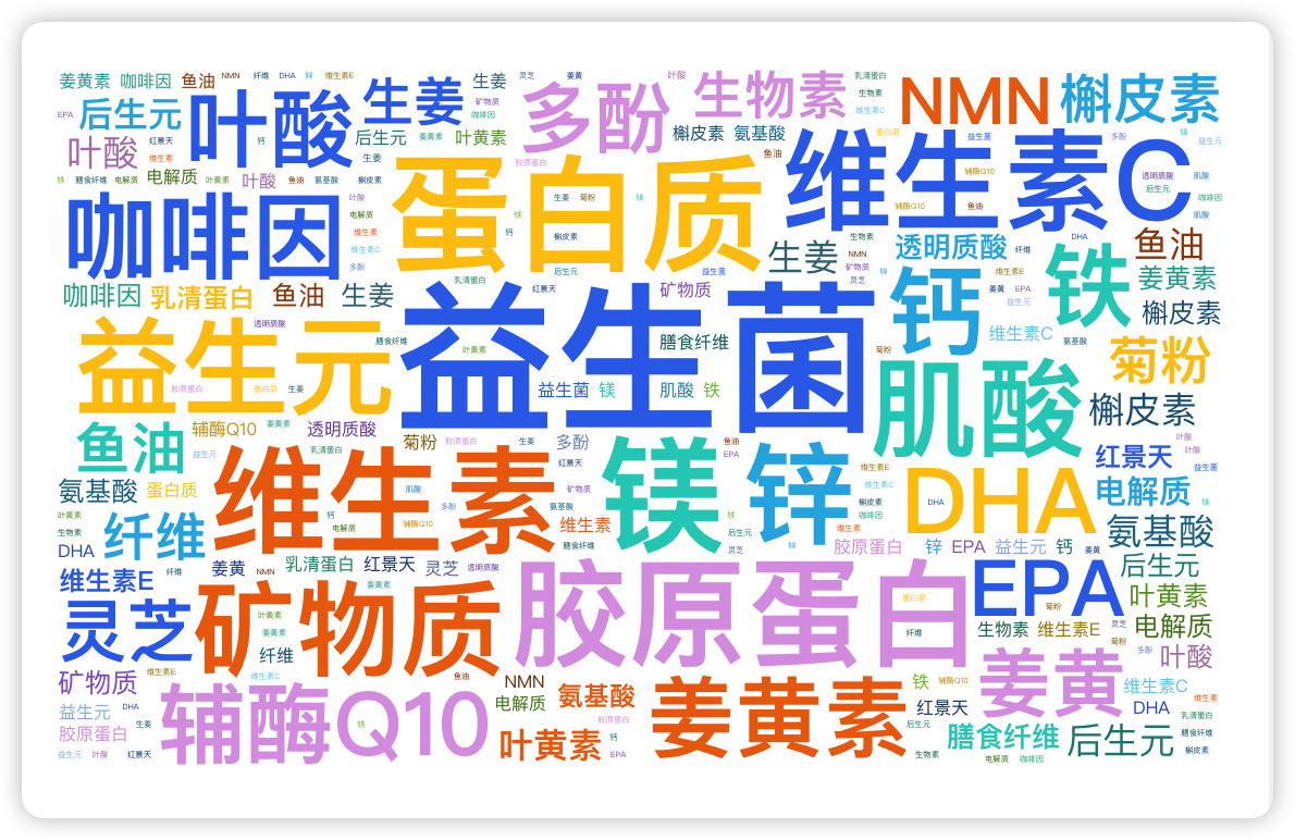 汇总分析2025 年 3 月到2025年12月24 日,nutraingredients 、trendhunter、nutritionaloutlook等网站上的 2000 多条资讯,总结了一份成份云图,如下;