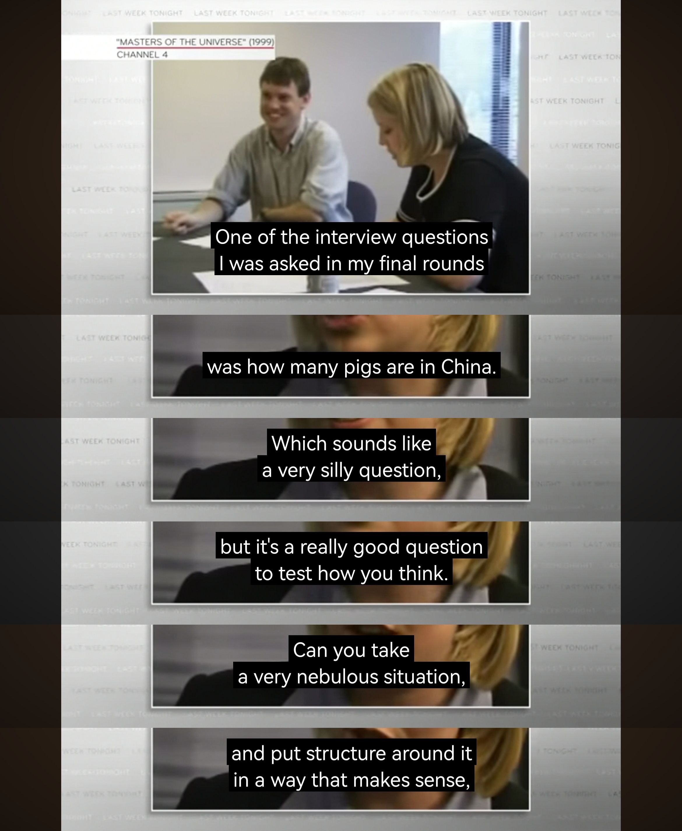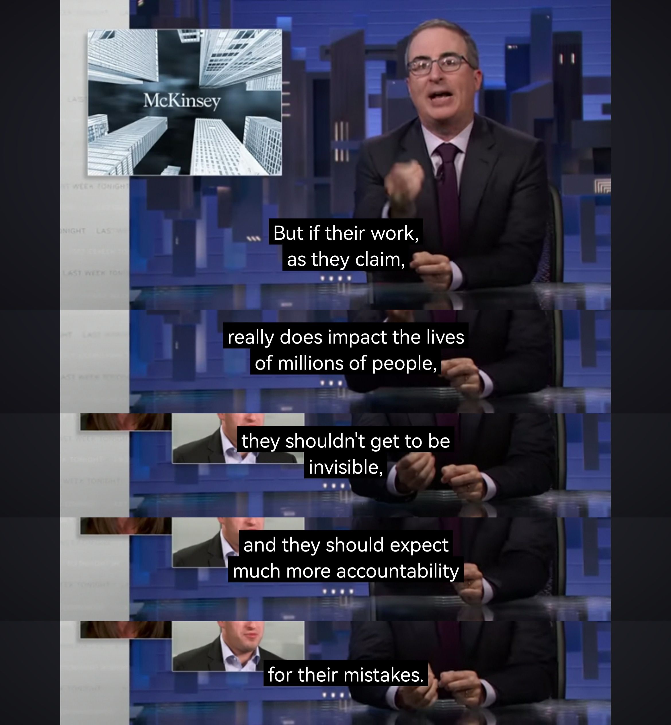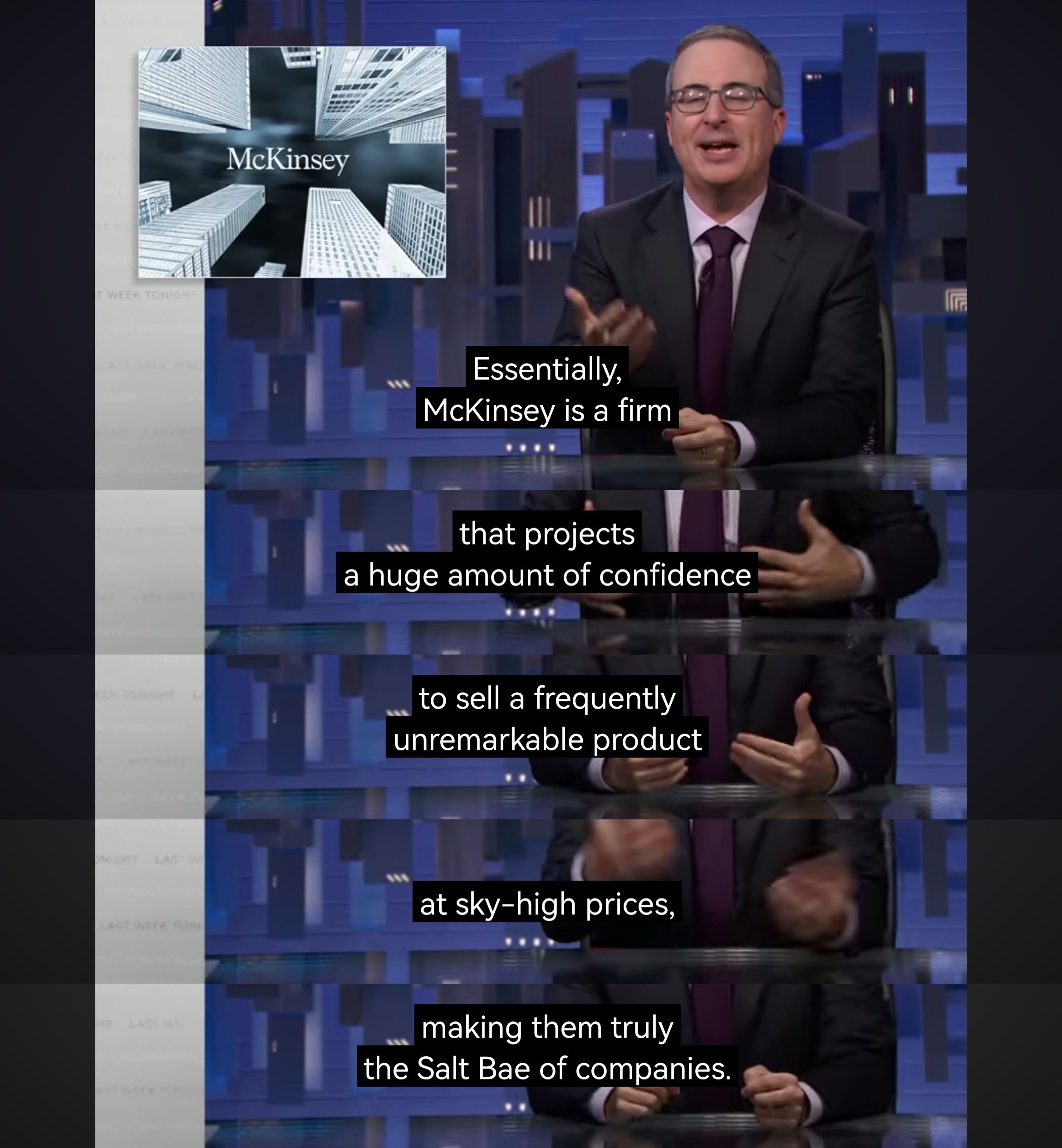 上周的last week tonight with john oliver火力全开直接对麦肯锡开炮,基本就说management consulting充斥着overpriced bullshit,而且为了钱可以降低道德底线。不过最近参加公司的一些training觉得当年做case的一些structured thinking跟engineering里的problemsolving principle还是有异曲同工之妙的。话说HBO真的不怕被麦肯锡告么[旺柴]