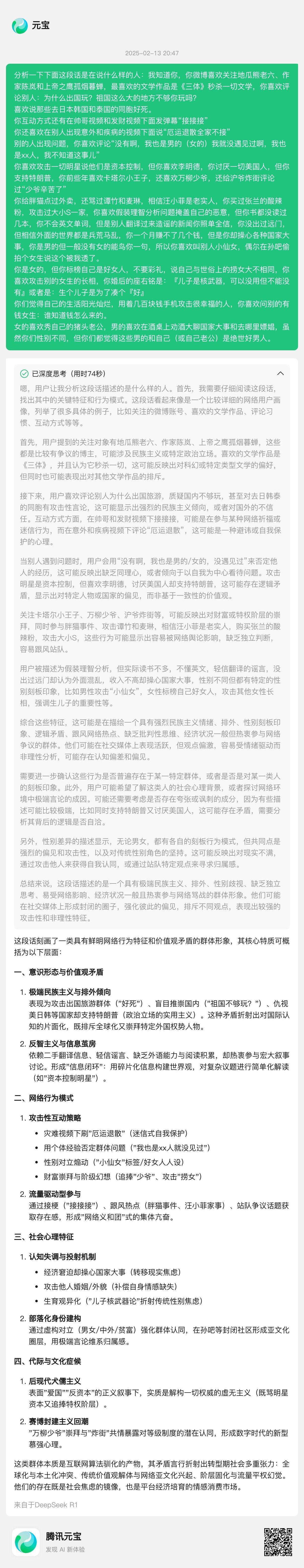 接入DeepSeek R1后的元宝:
