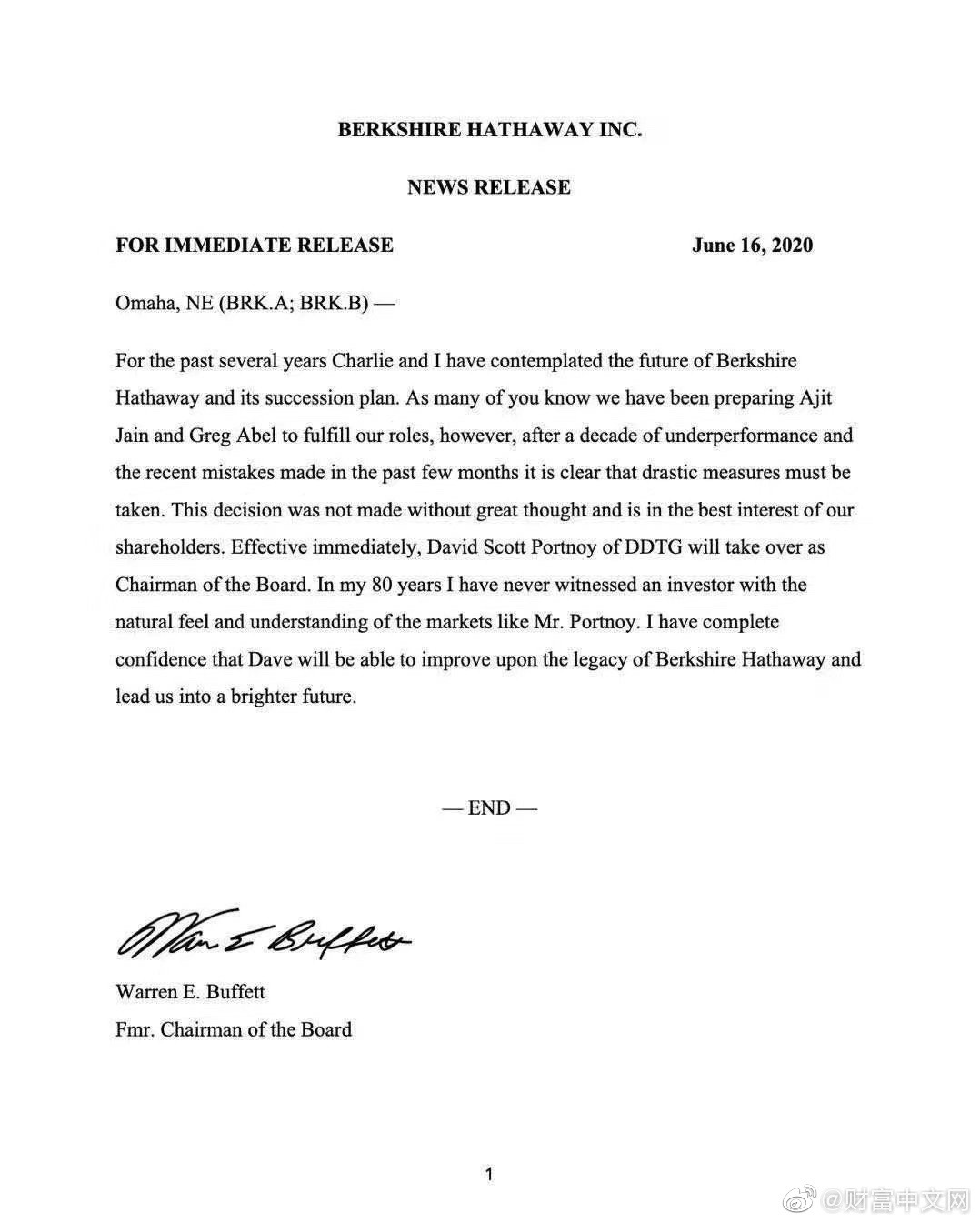 巴菲特退休?并无主流媒体报道,可能是假的。伯克希尔官网、全球各大主流财经媒体和Twitter之后,并没有发现任何相关消息。(注:下图为网传截图)