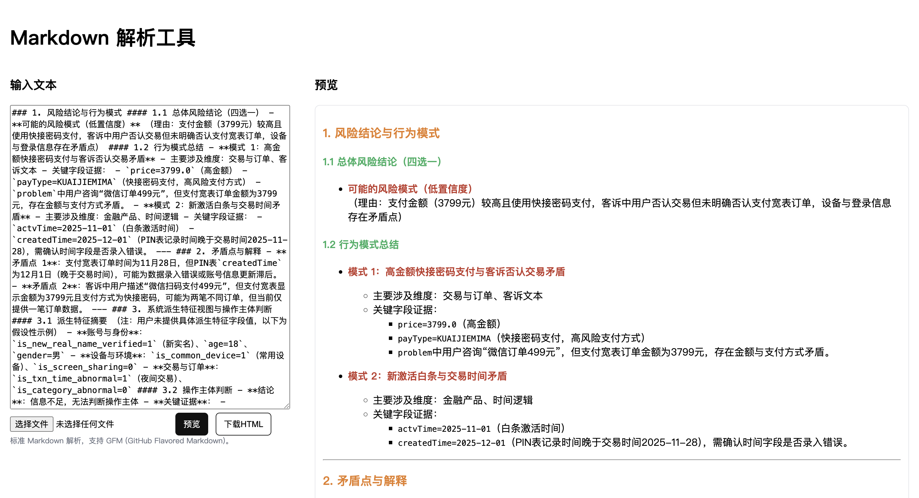 要啥工具就自己写,大模型虽然输出 markdown 格式,但一大团,可读性很差,不方便评估,写一个 markdown 解析工具结构化解析再来评估