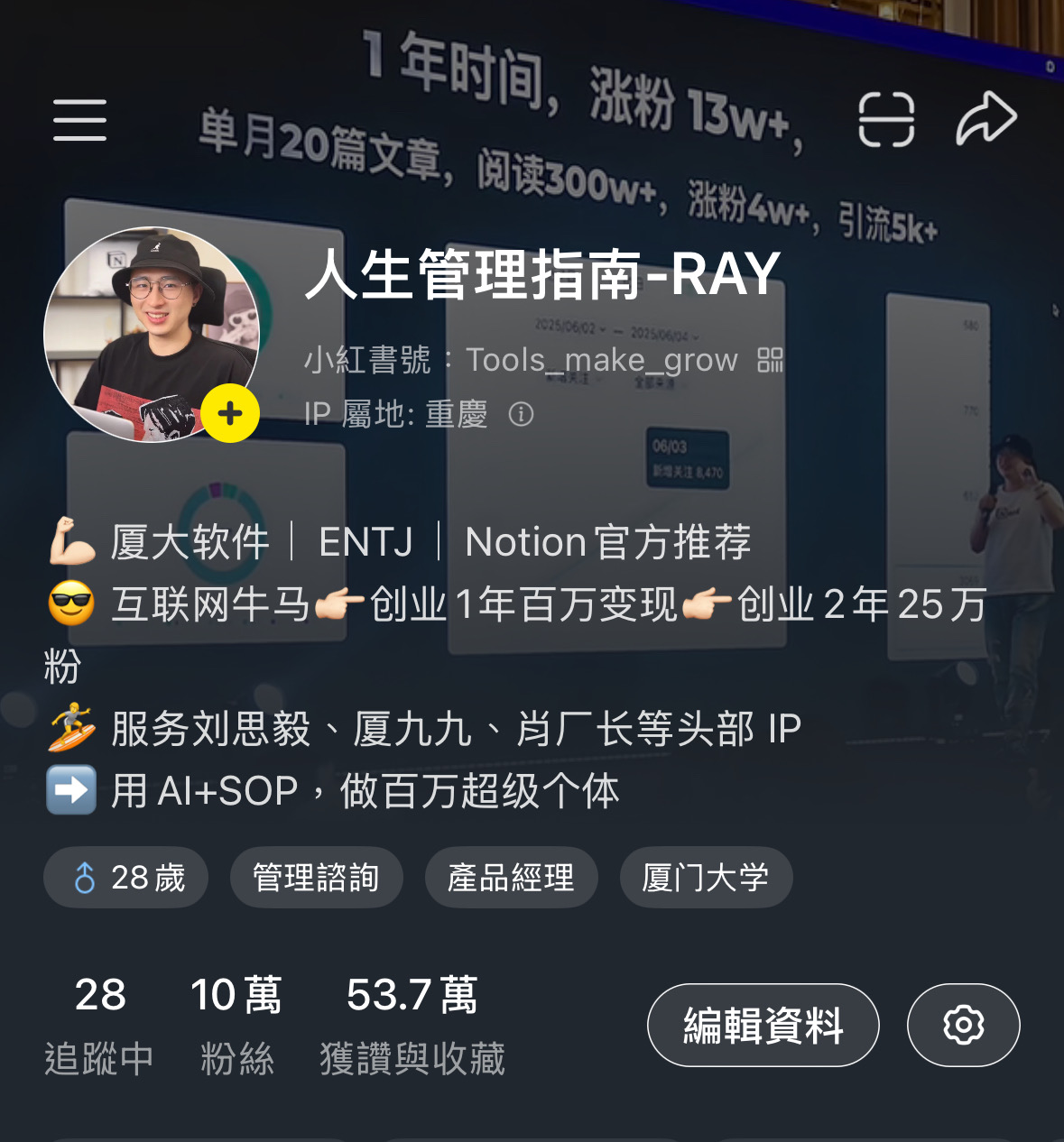 开始自媒体创业,23年底开始卖知识付费产品,24年算正式创业的第一年,做Notion赛道,赚到人生第一个100万,那一年我26岁;