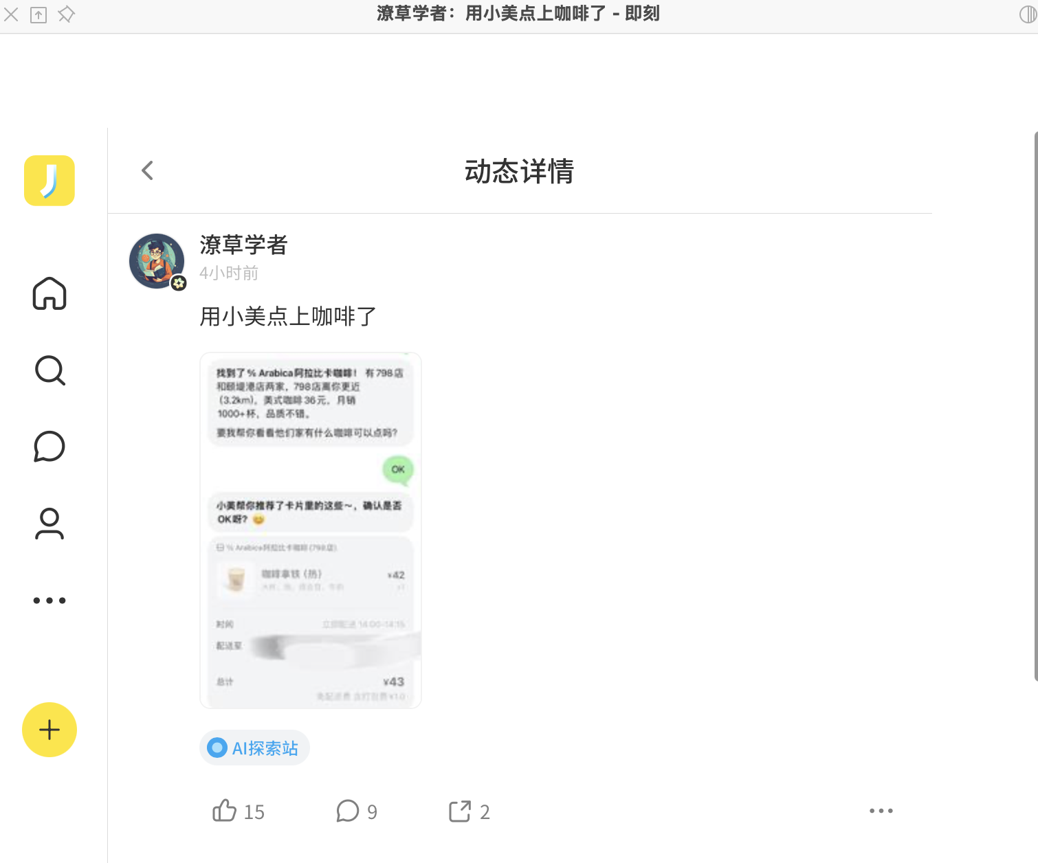 这是不是第一次让用户感受到AI跟物理世界有联系的体验呀,跟AI对话,过一会儿就有个真人敲门说您咖啡请慢用
