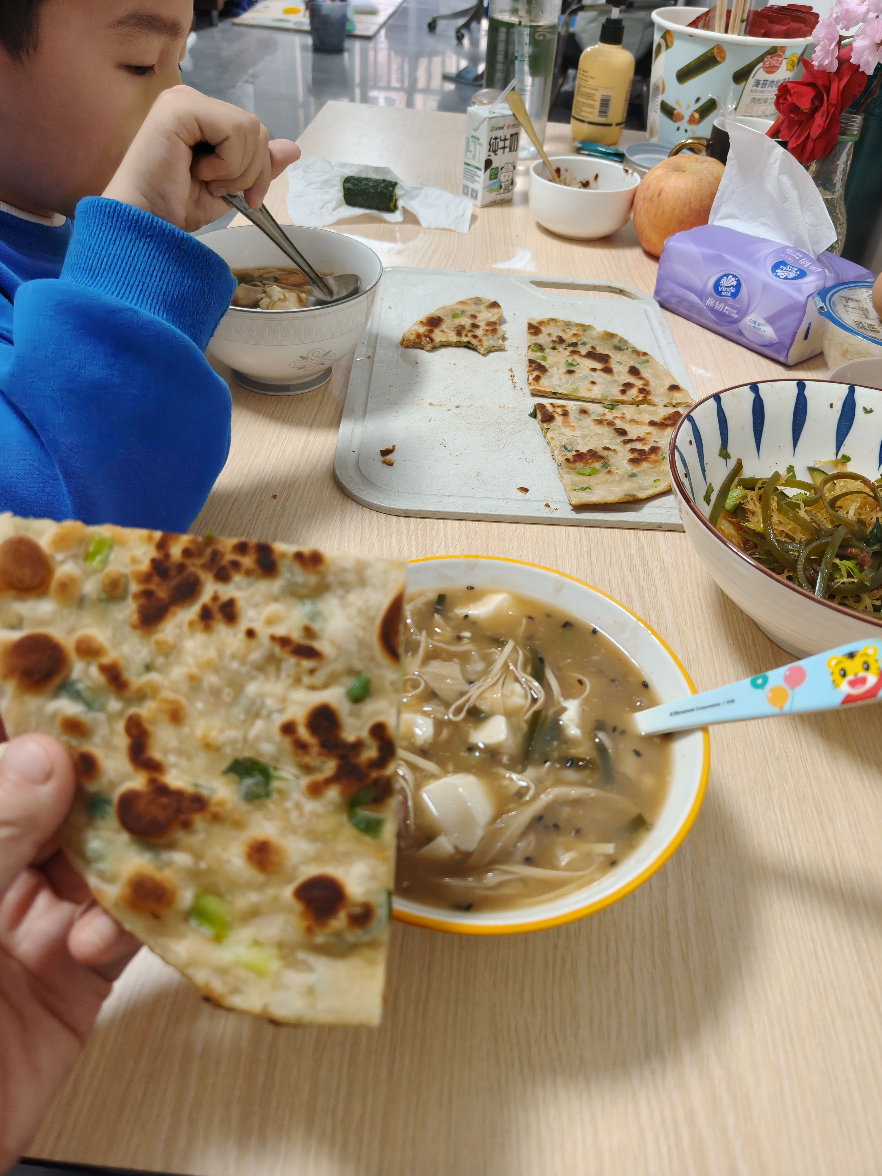 自己做的葱花油馍,面筋汤,孩子要吃带豆腐脑的,不会做,放点内酯豆腐,糊弄一餐