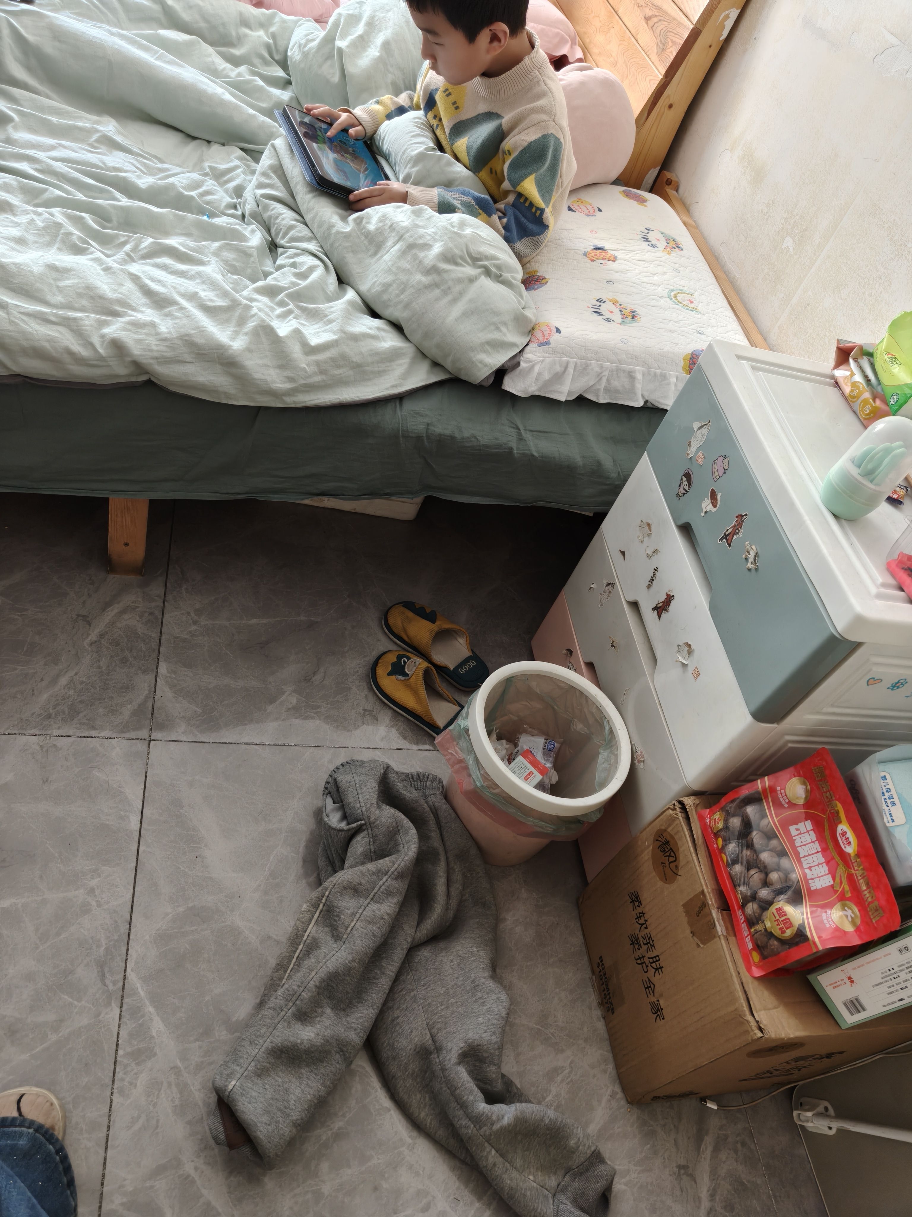 出去玩回来了,小朋友迫不及待的抱平板上床一气呵成,我直接吼裤子太脏不准上床!他立刻鞋子一踢开始脱裤子,我问他你干嘛啊,他说我脱了外面的不就可以上床了吗,也是,随你好了