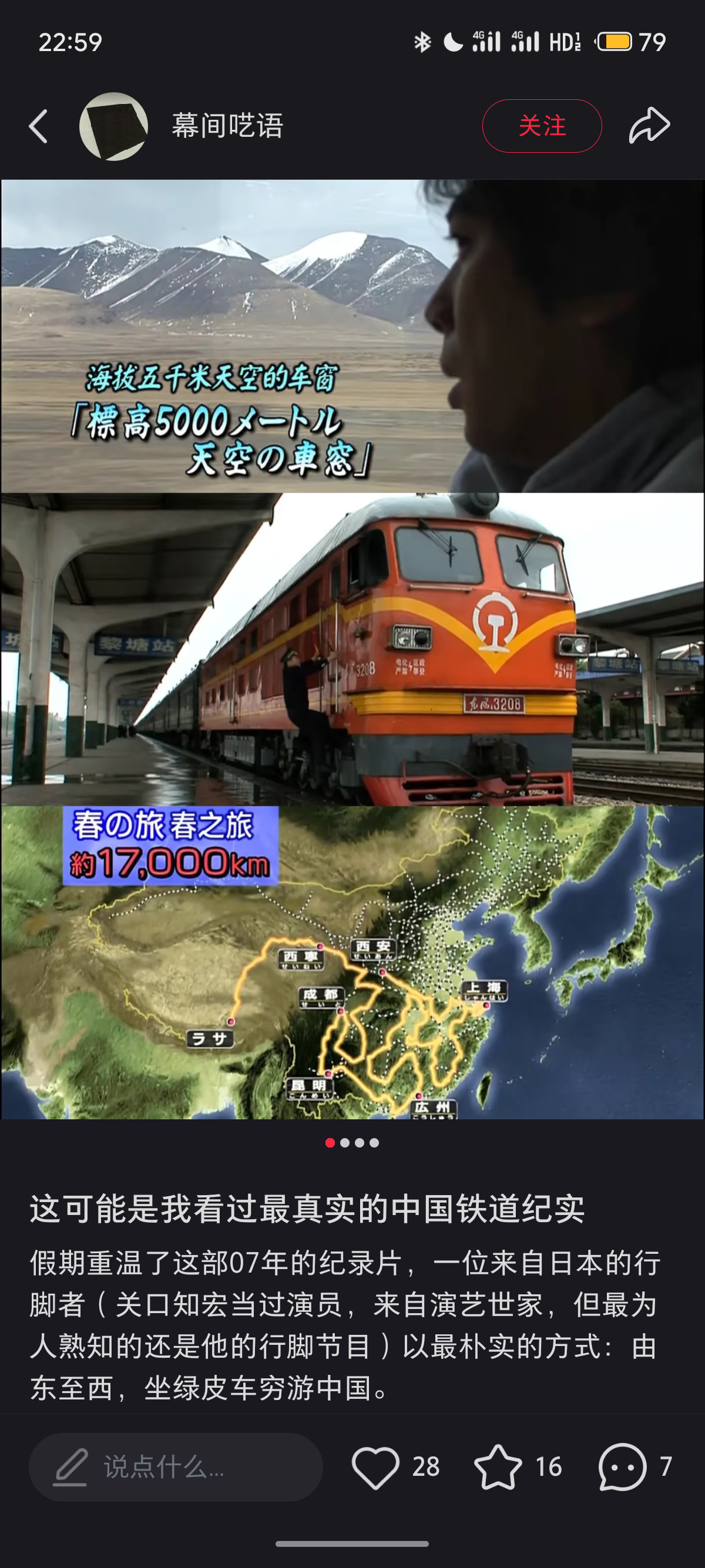 最近在重温一部19年前的纪录片,叫《关口知宏中国铁道大纪行》,2007年NHK拍摄的。内容是坐火车从拉萨出发,终到乌鲁木齐,途中遍历中国,总长度36000km。