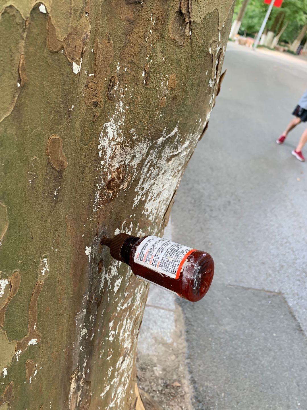 之前见过给树输液,今天第一次见给树打针💉的