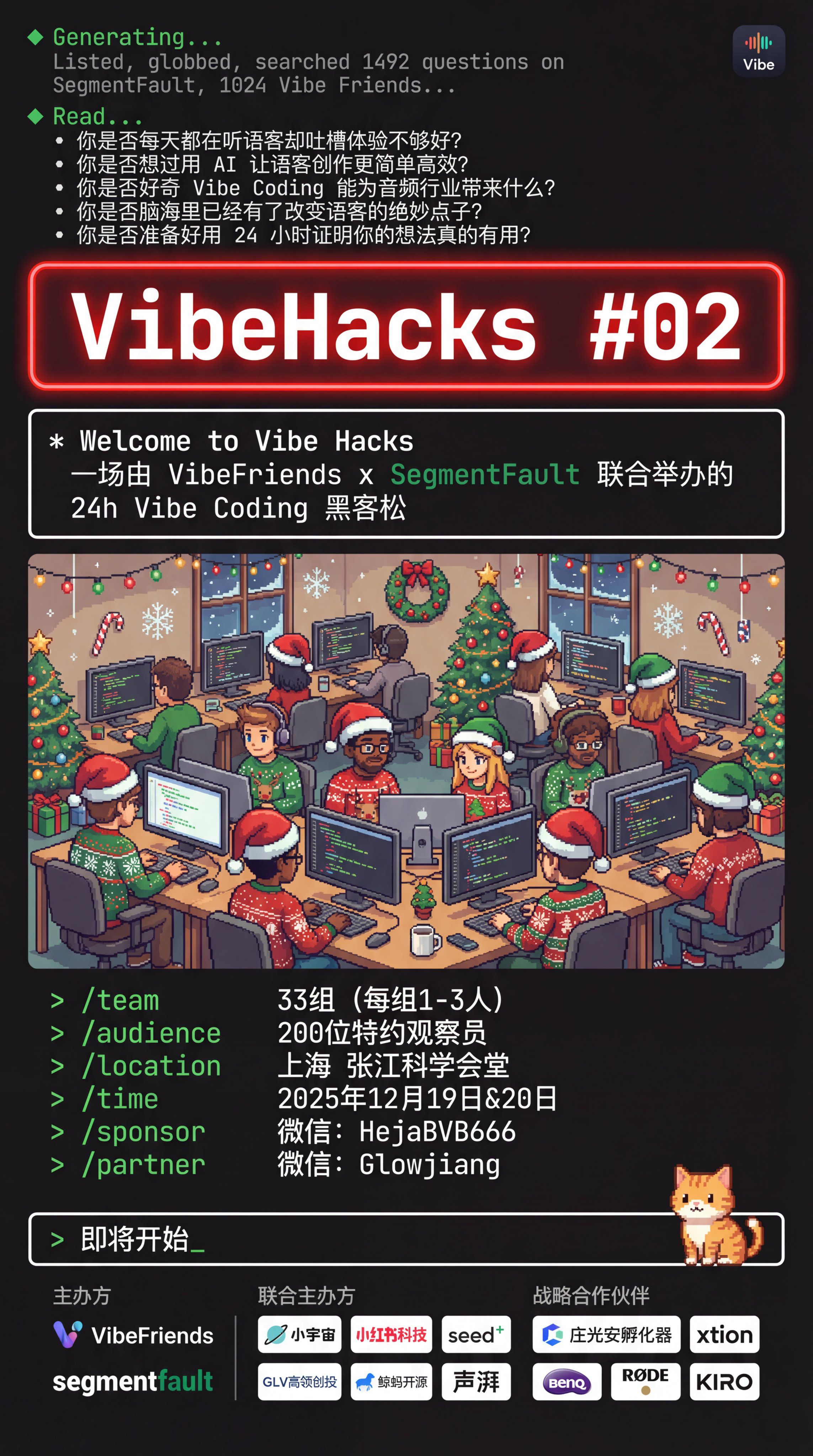 中文文本:"一场由 VibeFriends x SegmentFault 联合举办的 24h Vibe Coding 黑客松"