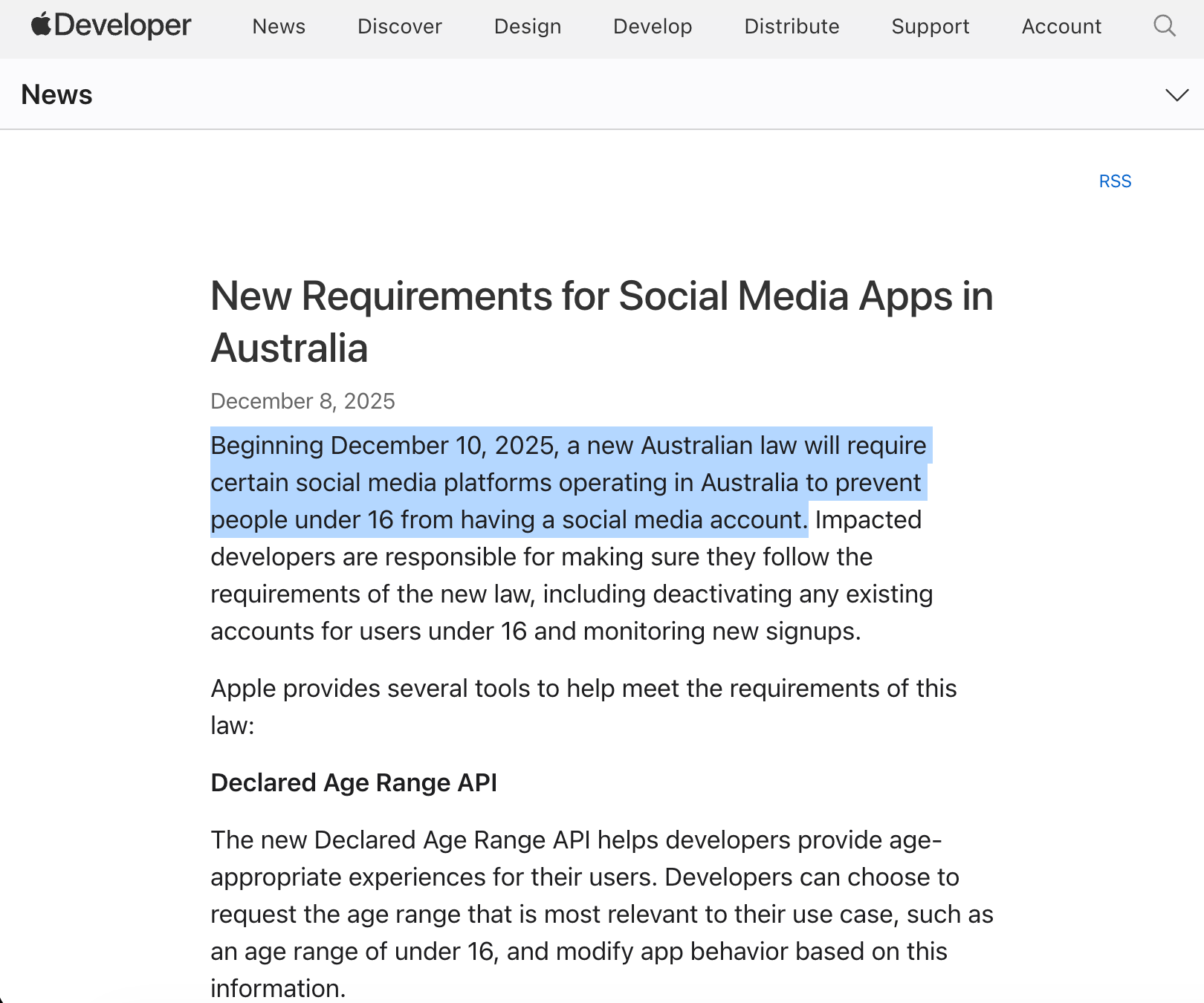 针对即将在12月10日正式生效的澳大利亚社交媒体新法令,Apple Developer面开发者发布全新的开发工具。此前,澳大利亚政府颁布法令,严令在本国运营的社交平台,禁止低于16岁用户的登入和使用。受此影响的开发者,需要确保他们的产品遵守这一新法令并为之负责,包括停用任何低于16岁用户的社交媒体账户、并监控新账户的创建。