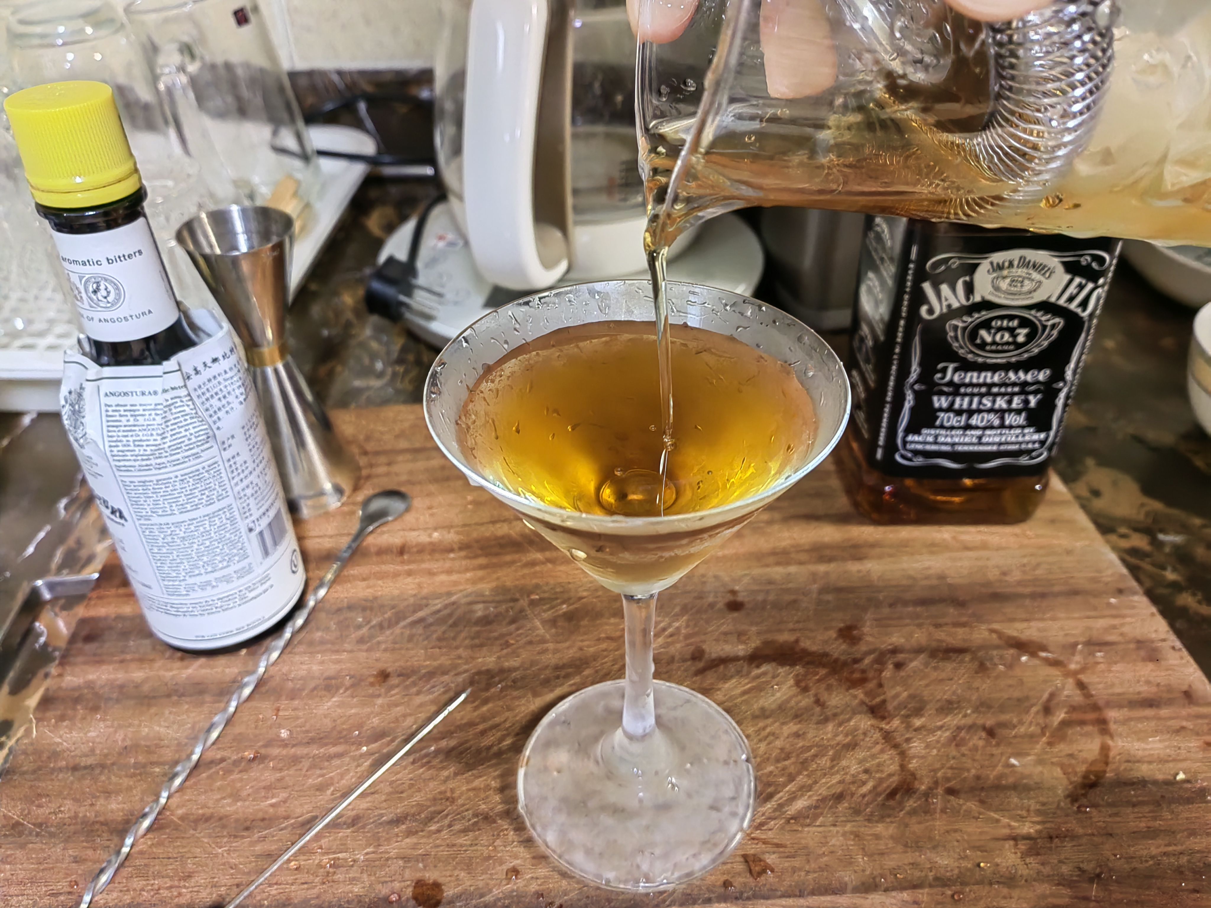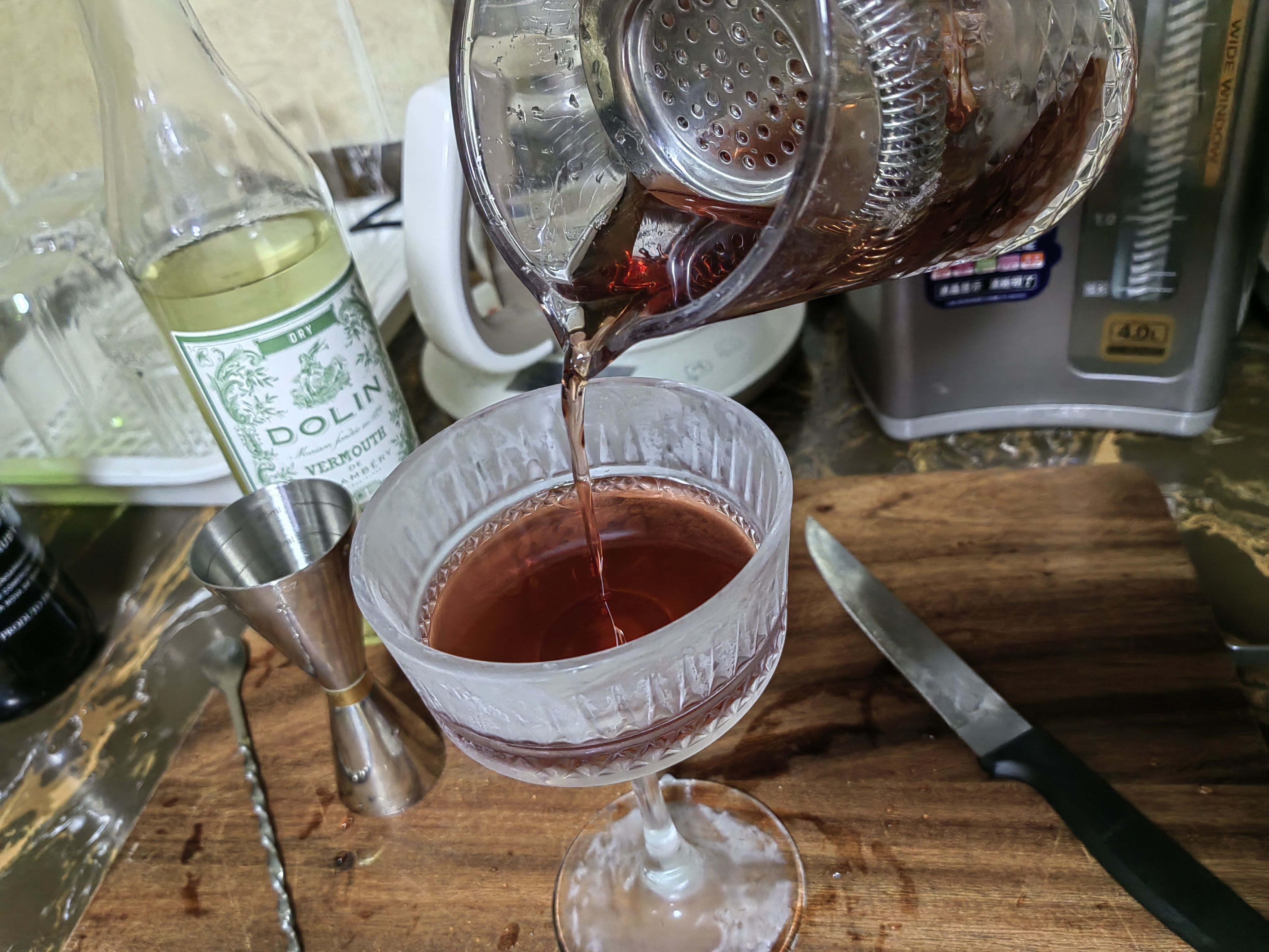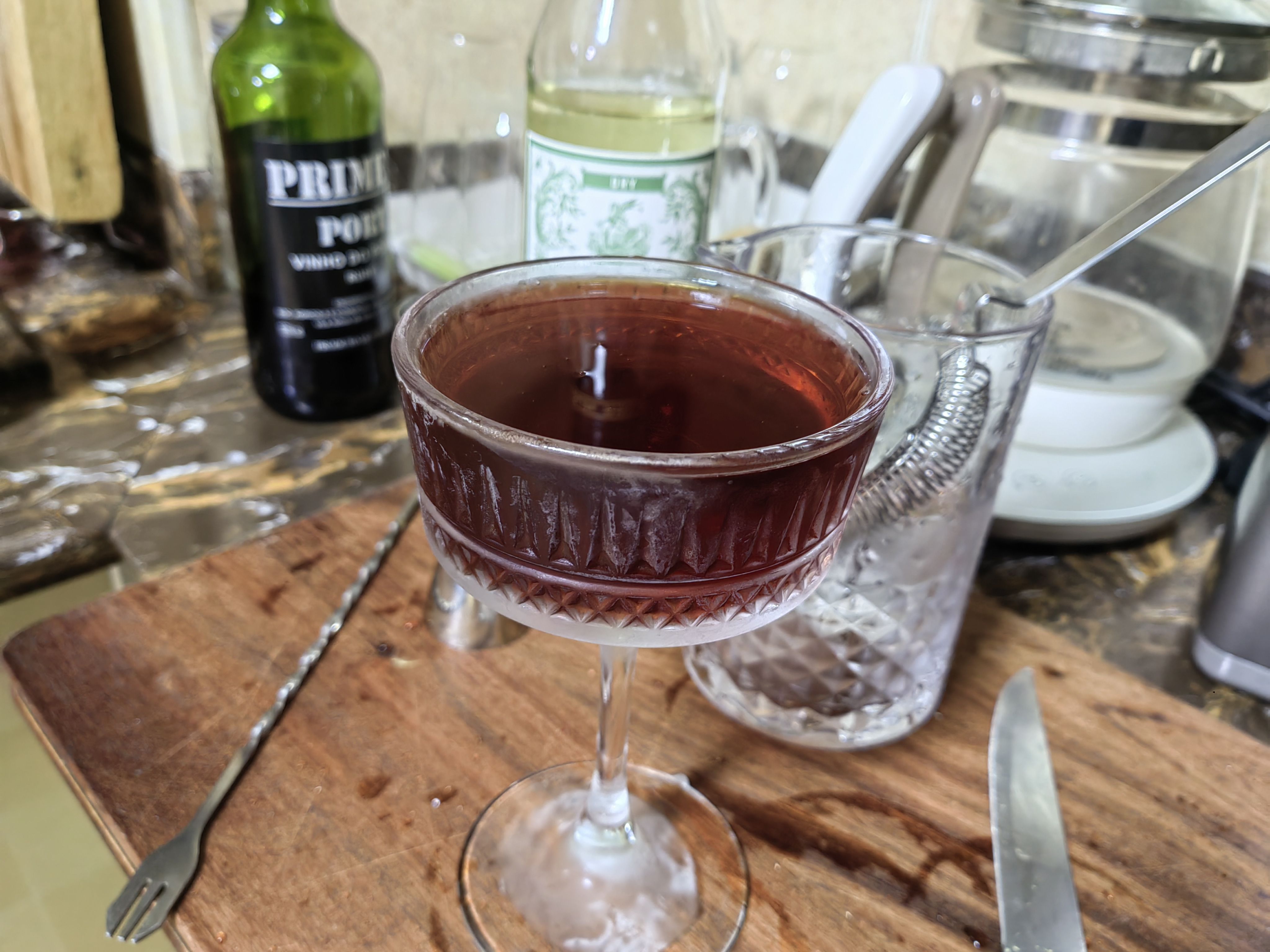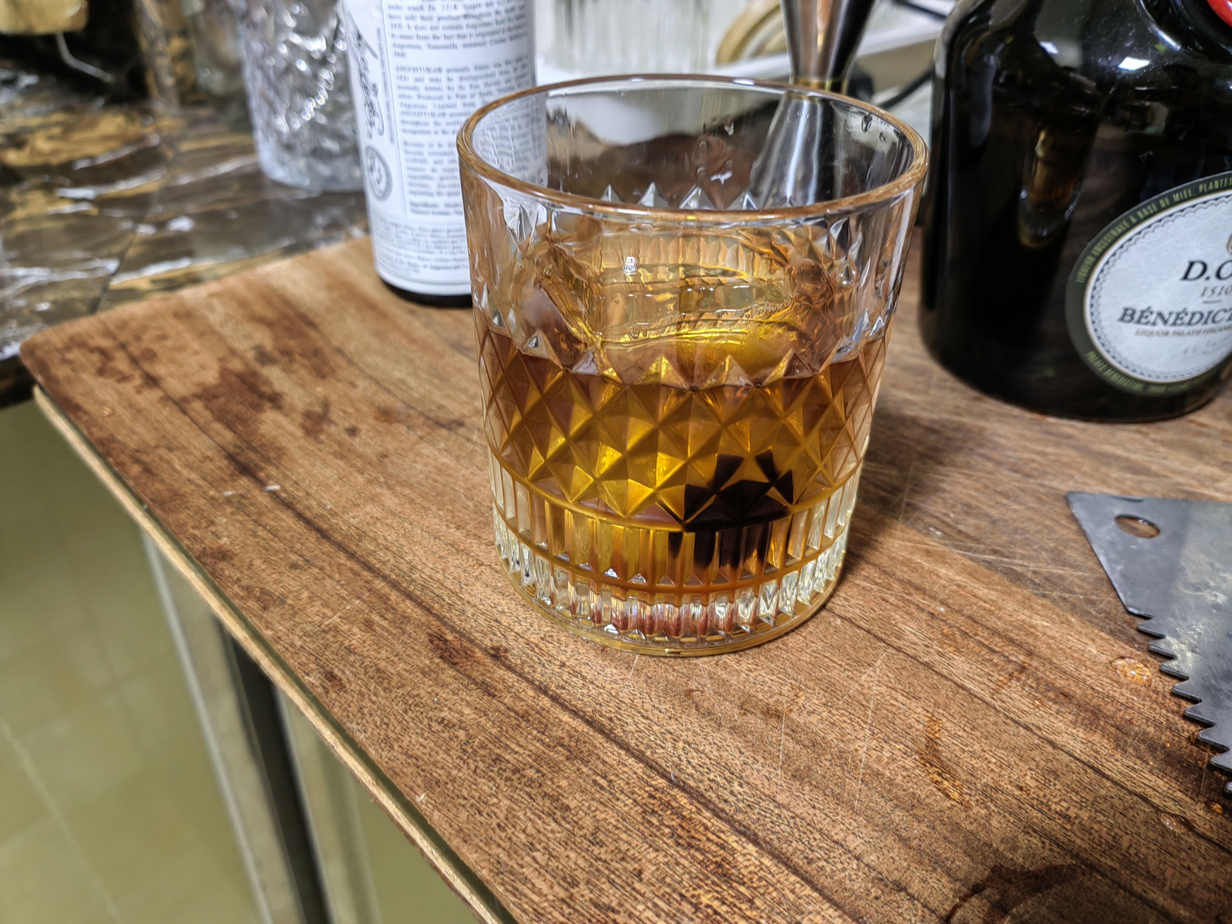 苦艾酒买了实在是喝不了一点,那股子香菜味接受不能,在调酒里只要加上一点就会让整杯饮料变成苦艾酒的味道,侵略性很强,但这个配方绝妙的压制了苦艾酒的怪味,让它在里面成为风味陪衬,甜中带着一点奇异的香味,咽下以后又在喉咙里翻腾,很妙。